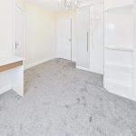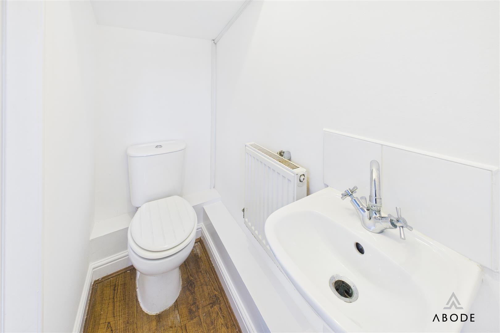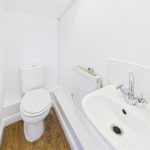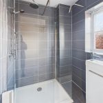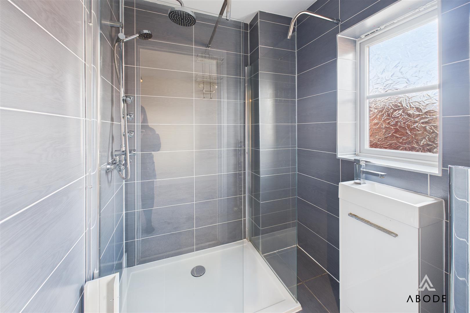 Walk in shower, vanity sink unit with wash hand basin and storage cupboard, chrome ladder style radiator and a UPVC double glazed window.