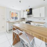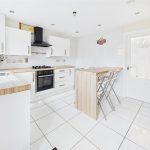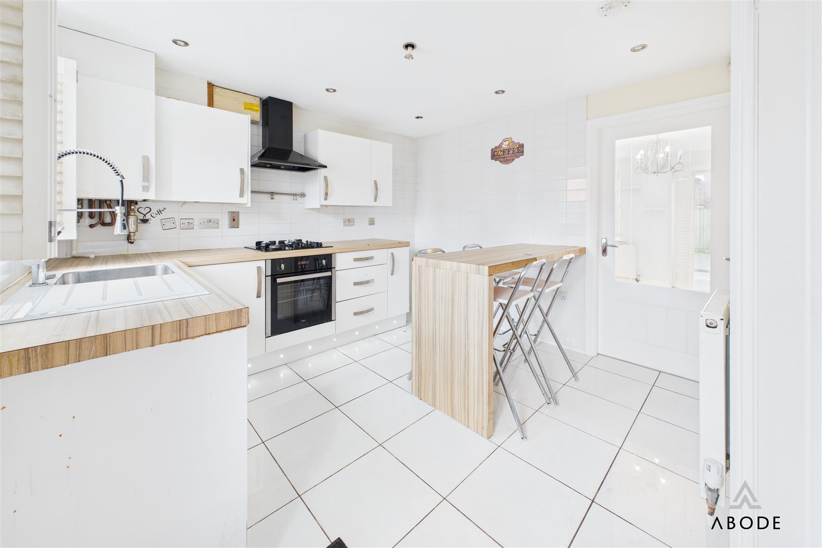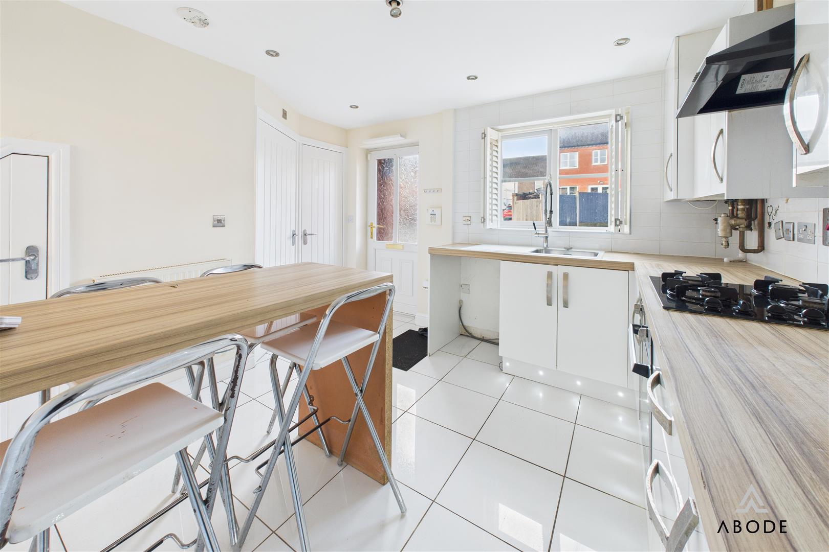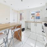 Entrance door into the kitchen with fitted wall mounted base and drawer units with work surfaces and a breakfast bar. Sink unit, fitted cooker, appliance spaces, two storage cupboards and radiator.