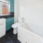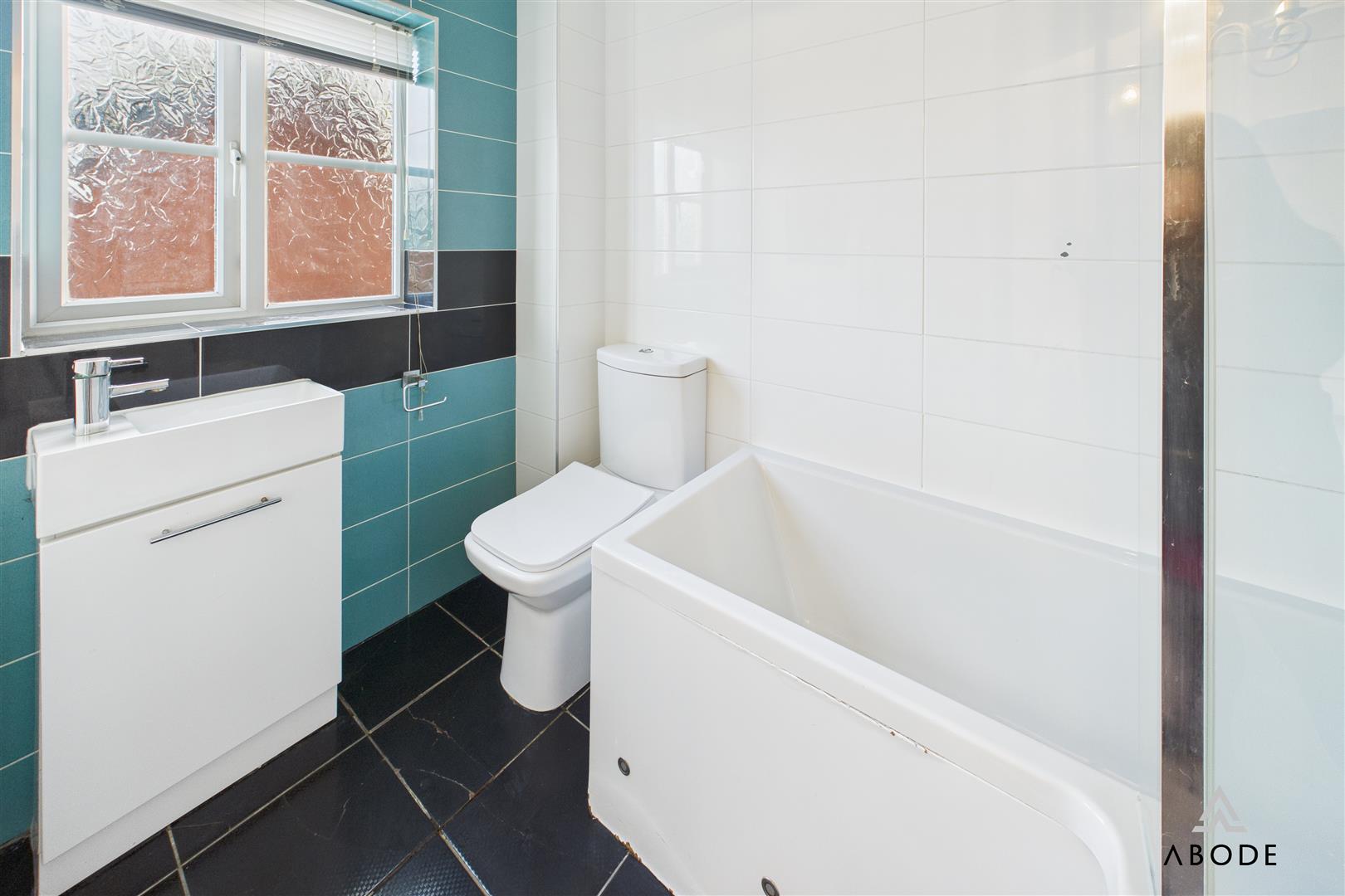 P shaped panel enclosed bath with a shower over, vanity sink unit with wash hand basin and storage cupboard, low flush wc, radiator and UPVC double glazed window.