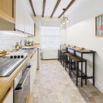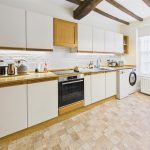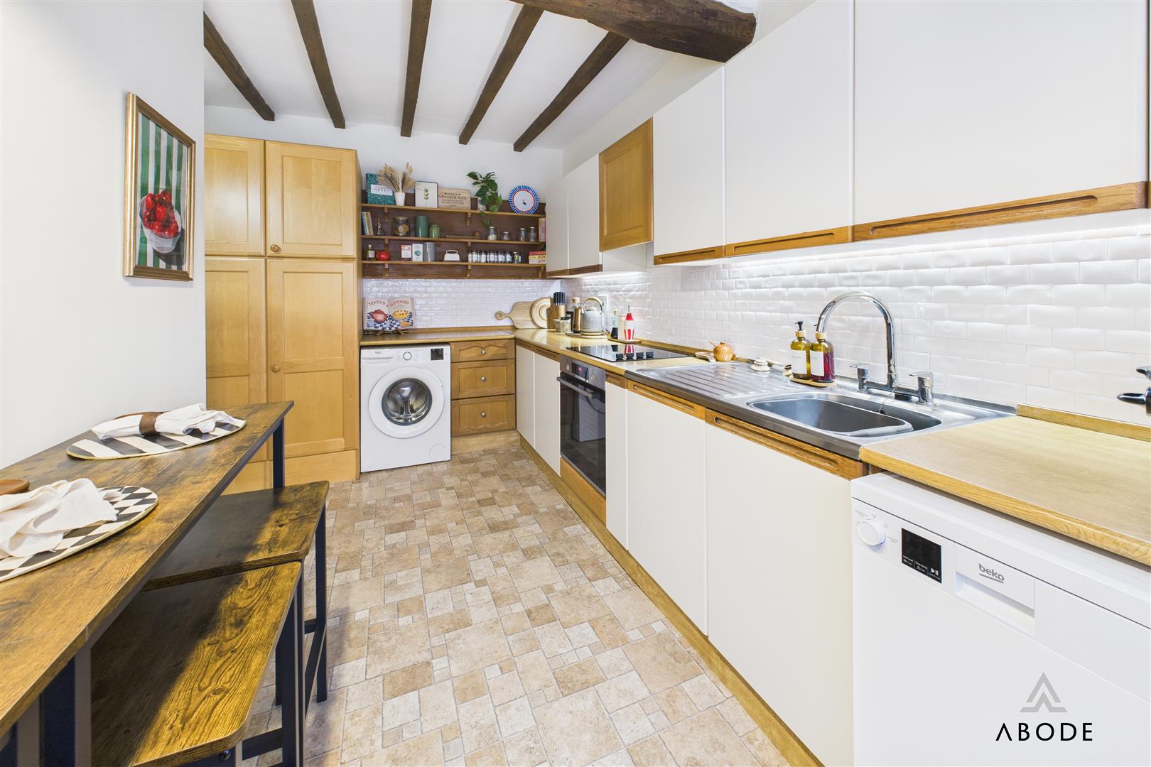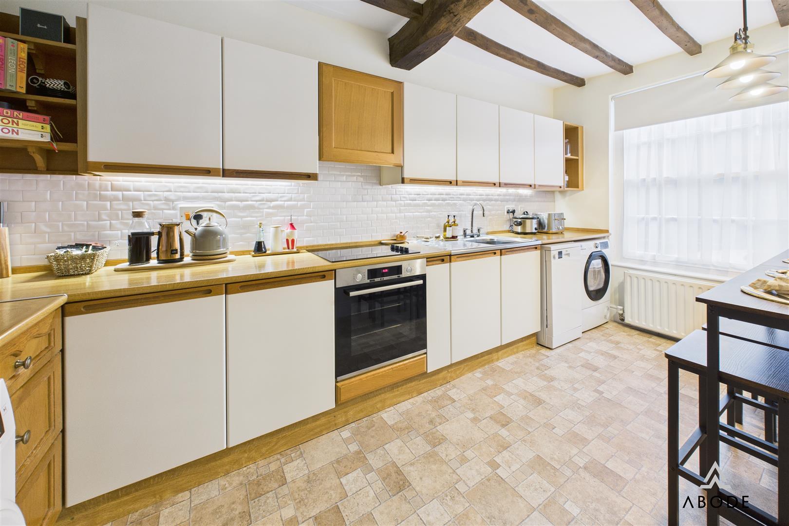 Fitted wall mounted, base and drawer units with work surfaces and a sink and drainer unit with mixer tap. Fitted electric oven and hob with extractor hood, sash window to the front elevation, radiator, plumbing and space for a washing machine and dishwasher and further appliance spaces.