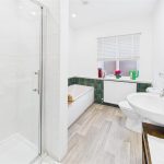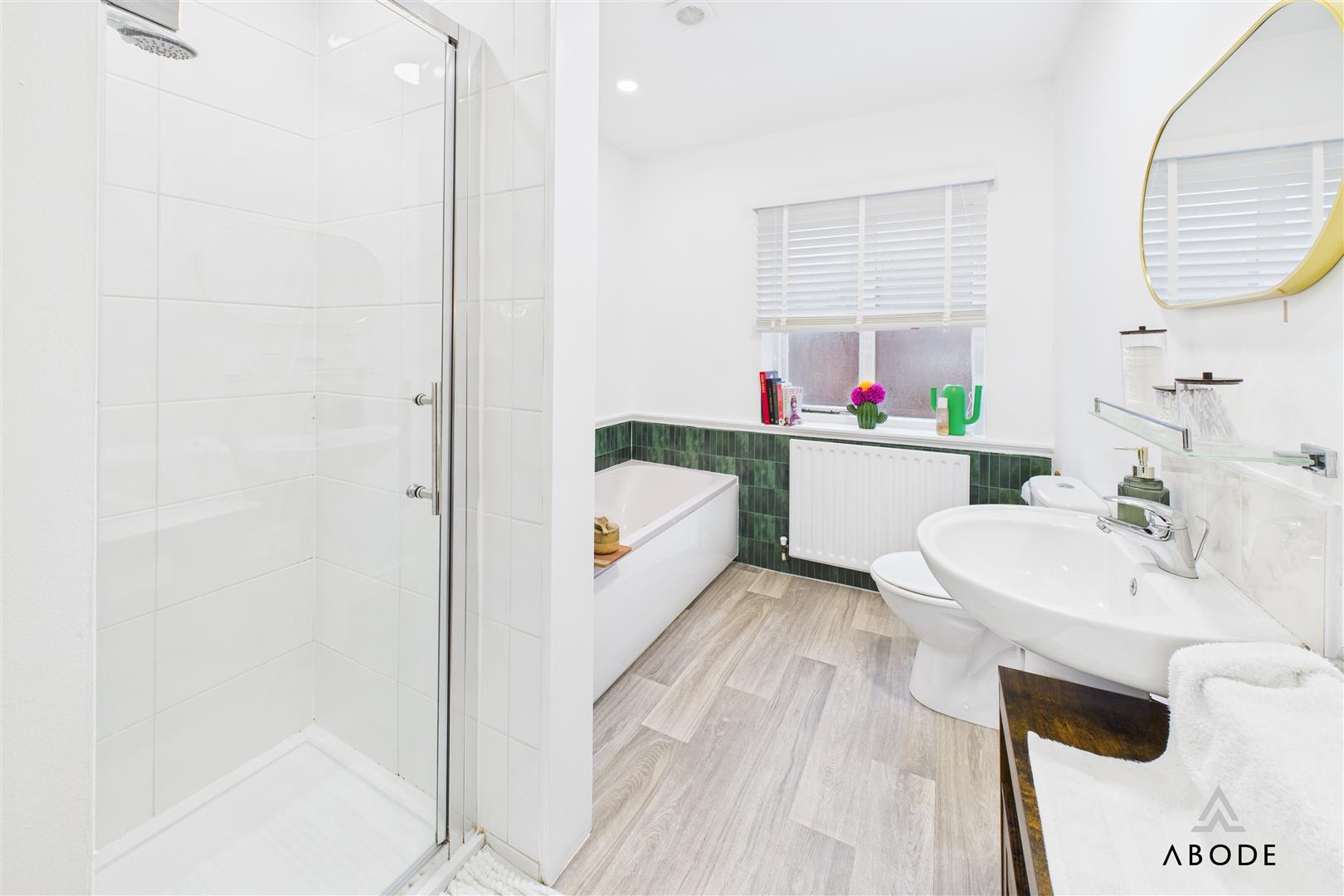 Panel enclose bath, separate shower, wash hand basin, low flush WC, radiator and window to the front elevation.