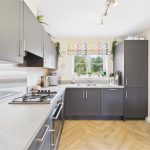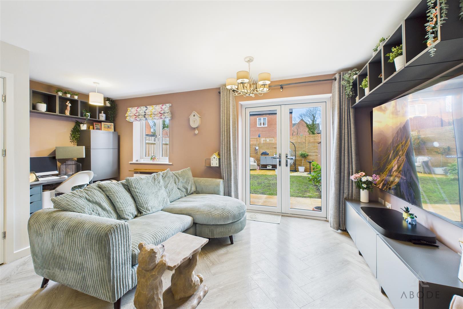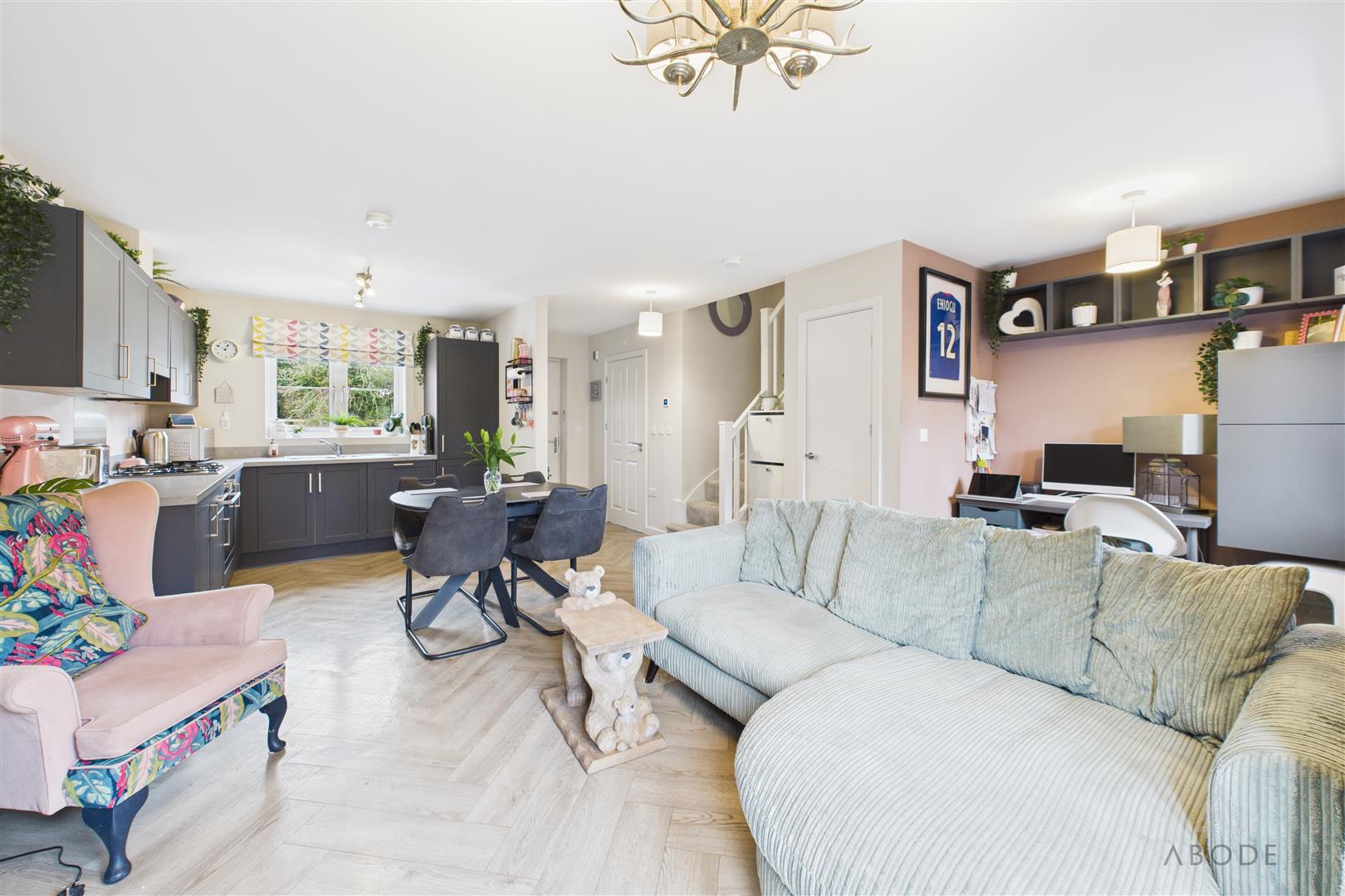 The ground floor is centred around an impressive open-plan kitchen, dining and living area, finished with modern herringbone-style flooring and designed for both everyday living and entertaining. The living area enjoys generous proportions with space for a range of seating, a feature media wall and double glazed French doors opening directly onto the rear garden, allowing plenty of natural light.