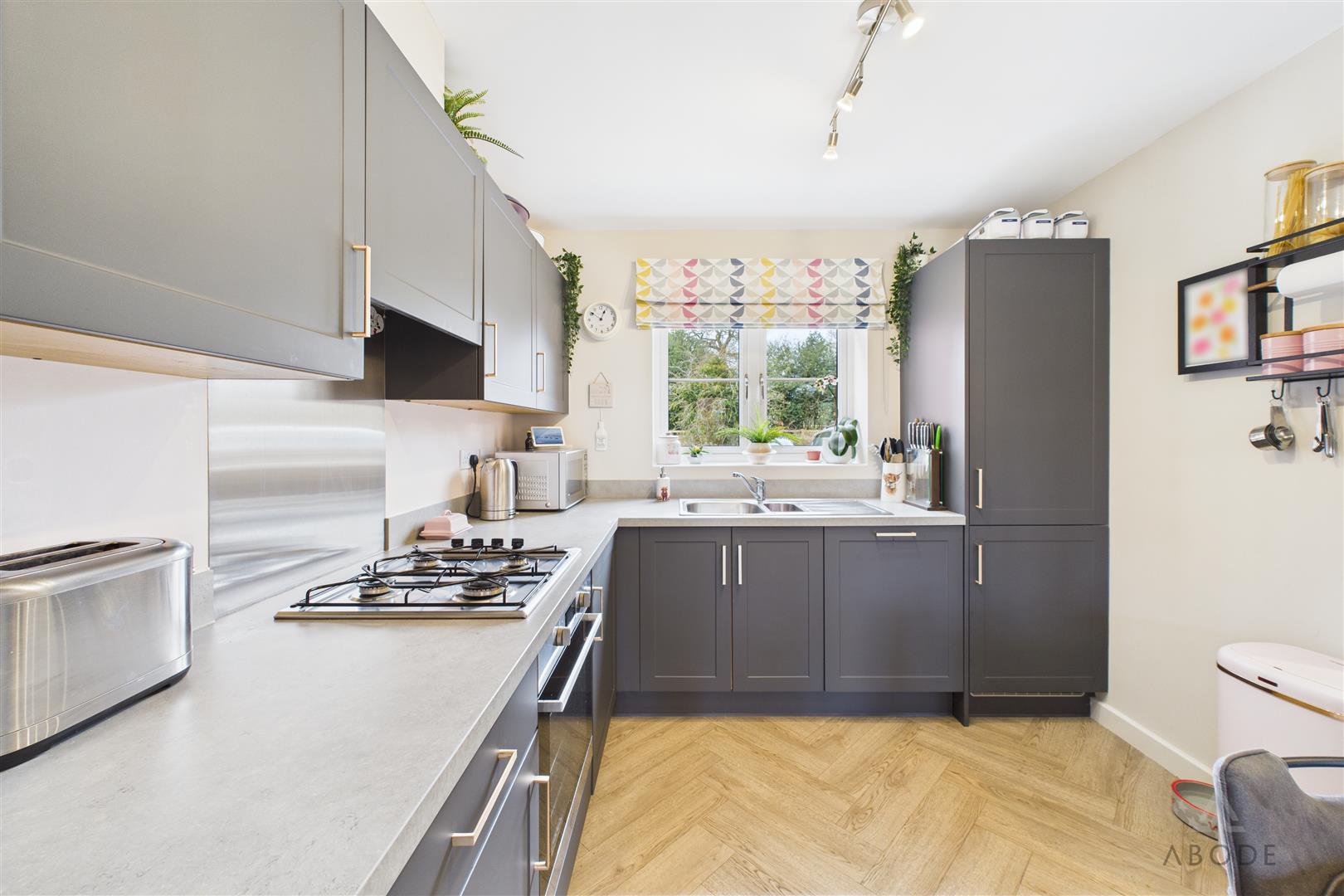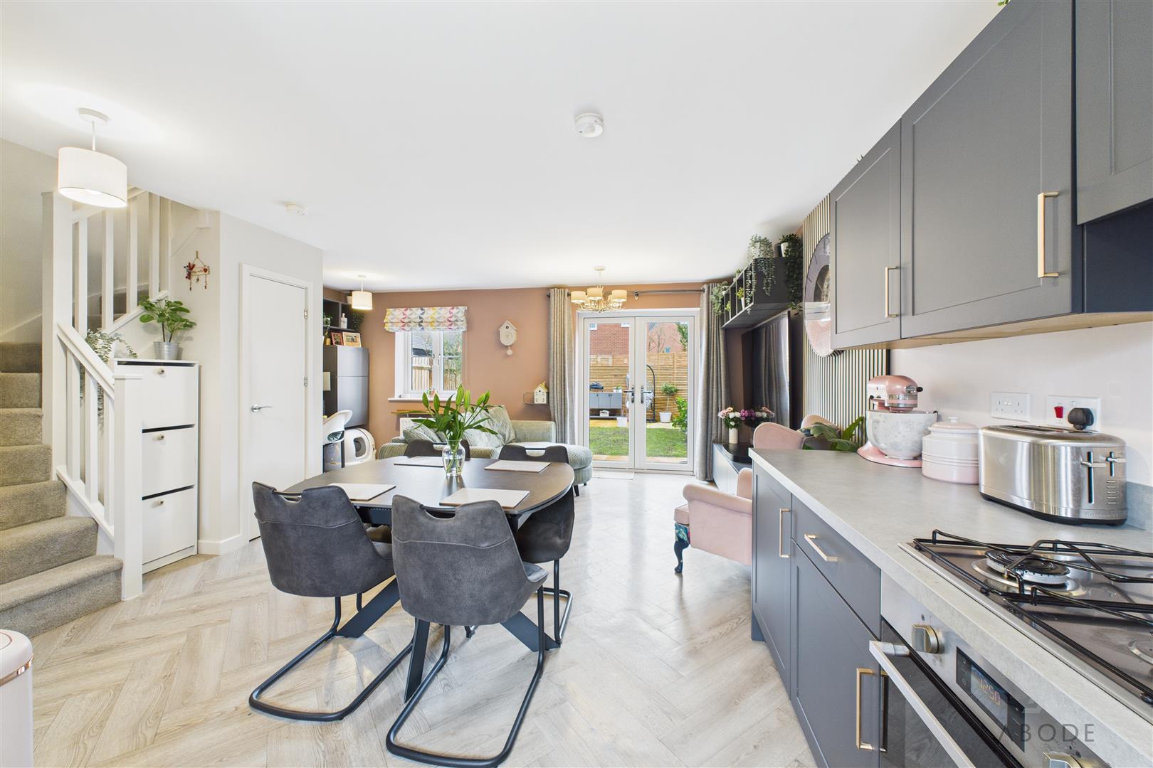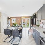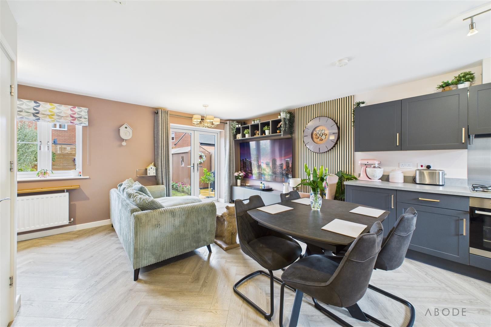 The kitchen is fitted with a contemporary range of wall and base units with complementary work surfaces, incorporating a four-ring gas hob with extractor over, integrated oven, dishwasher, sink with mixer tap and drainer, and space for additional appliances. The dining area sits comfortably between the kitchen and living space, offering ample room for a family dining table.