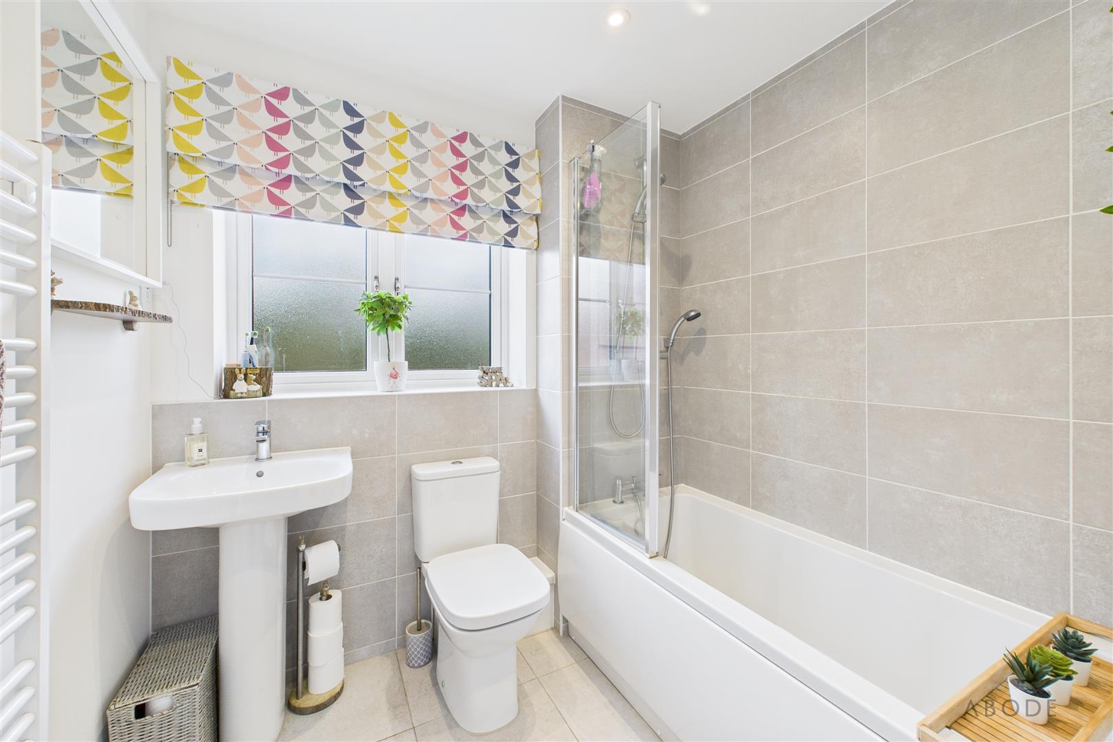 The family bathroom is fitted with a modern three-piece suite, comprising a panelled bath with shower over, wash hand basin and low-level WC, finished with contemporary tiling and a double glazed window.