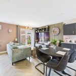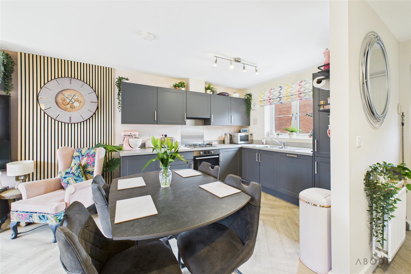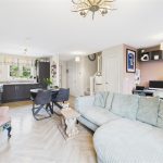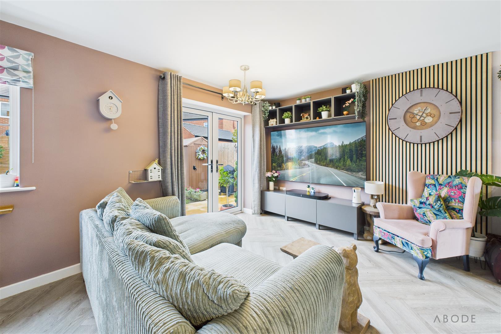 The ground floor is centred around an impressive open-plan kitchen, dining and living area, finished with modern herringbone-style flooring and designed for both everyday living and entertaining. The living area enjoys generous proportions with space for a range of seating, a feature media wall and double glazed French doors opening directly onto the rear garden, allowing plenty of natural light.