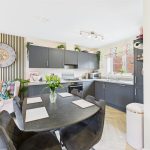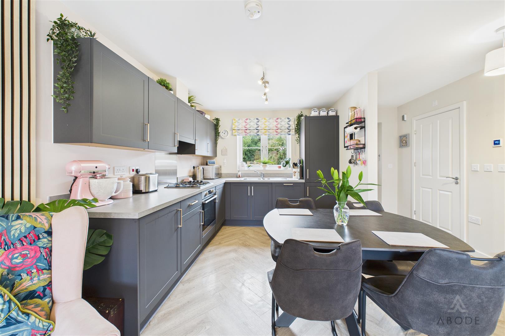 The kitchen is fitted with a contemporary range of wall and base units with complementary work surfaces, incorporating a four-ring gas hob with extractor over, integrated oven, dishwasher, sink with mixer tap and drainer, and space for additional appliances. The dining area sits comfortably between the kitchen and living space, offering ample room for a family dining table.