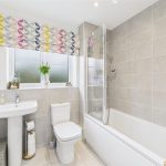 The family bathroom is fitted with a modern three-piece suite, comprising a panelled bath with shower over, wash hand basin and low-level WC, finished with contemporary tiling and a double glazed window.