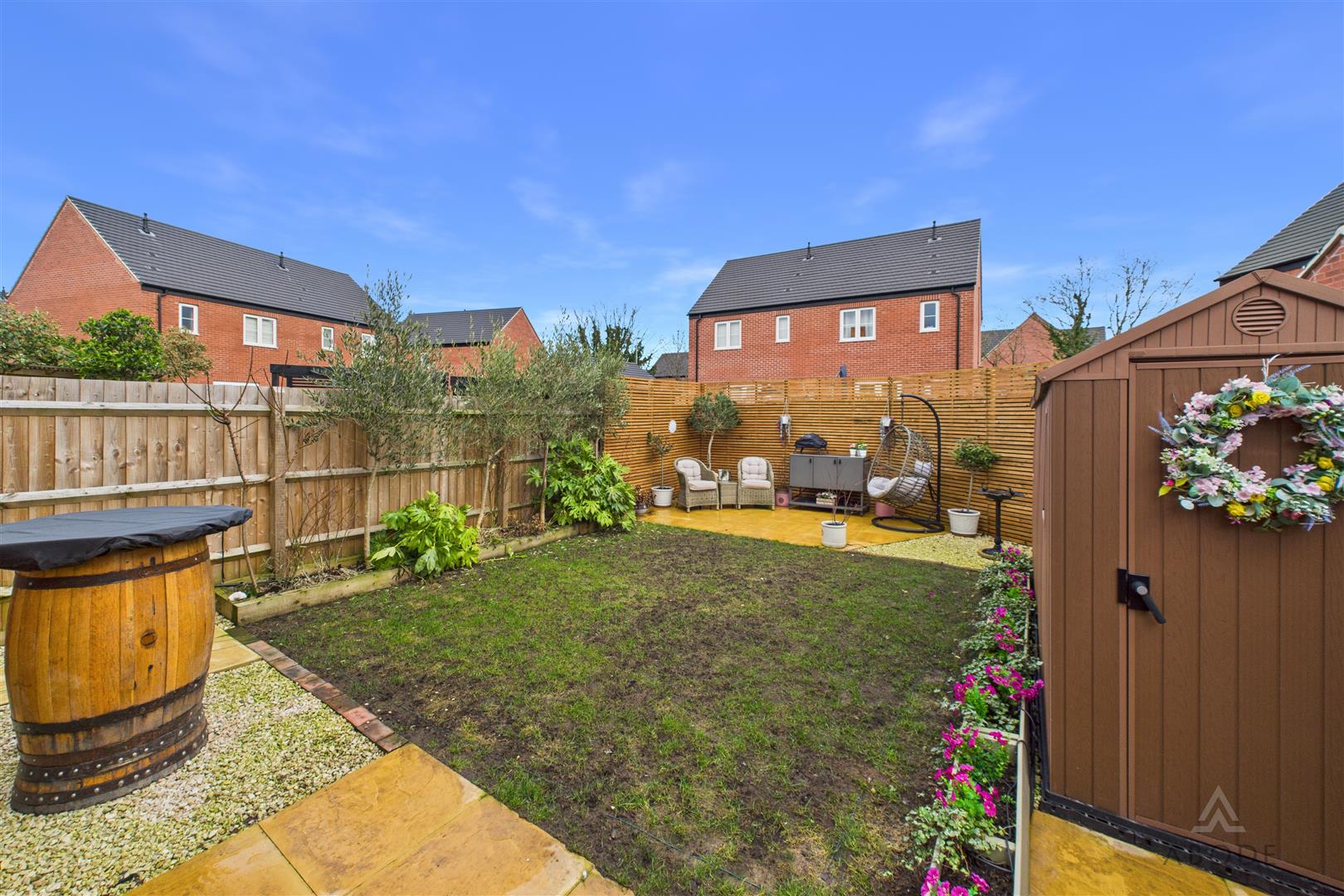 The rear garden is fully enclosed and has been thoughtfully landscaped to include a paved patio area adjacent to the property, a central lawn, raised borders with planting and a further seating area to the rear. A timber garden shed provides useful outdoor storage, and the garden offers an excellent balance of practicality and outdoor entertaining space.