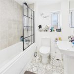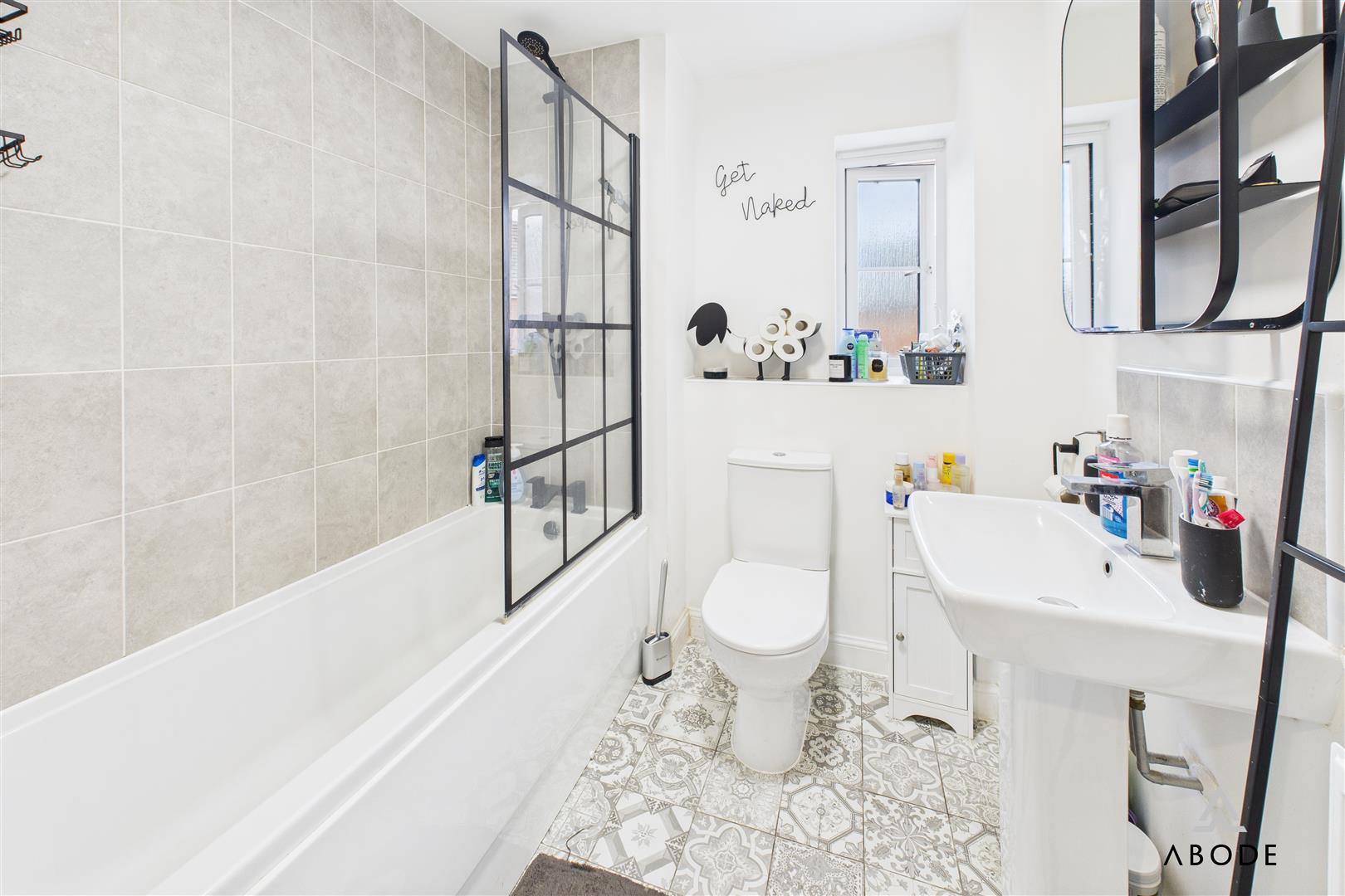 Panel enclosed bath with a shower and shower screen, low flush wc, wash hand basin, radiator and upvc double glazed window.