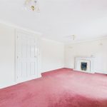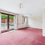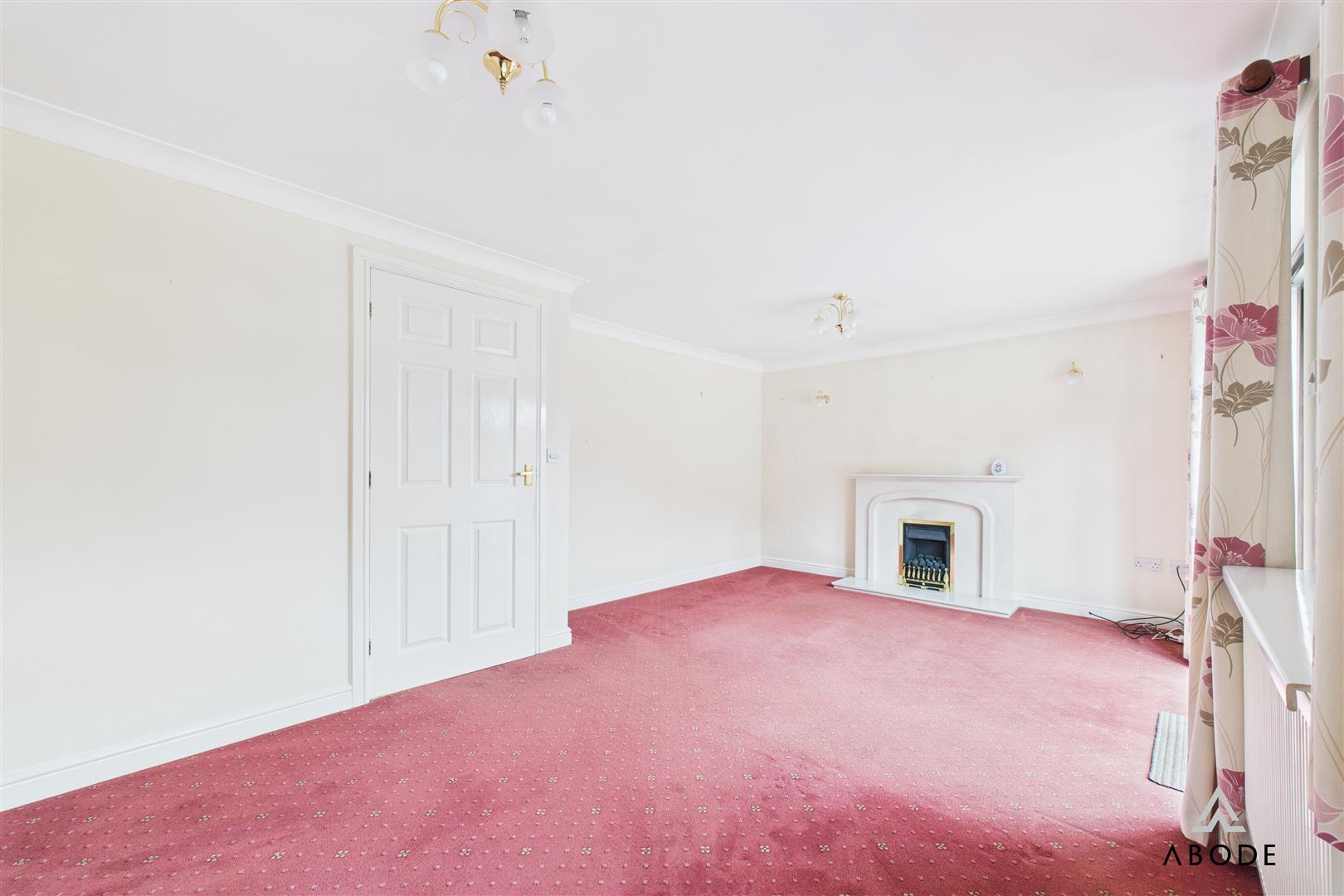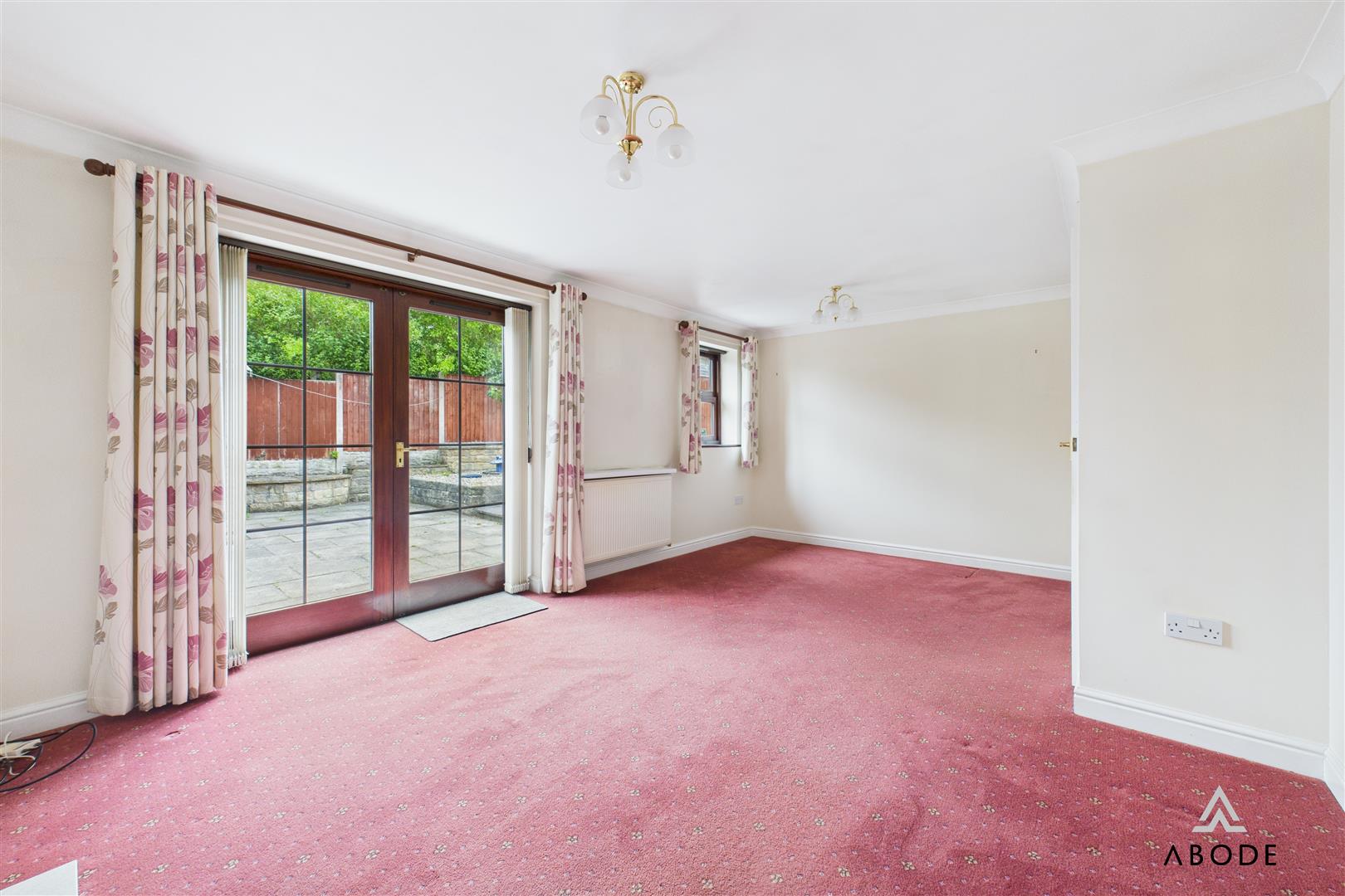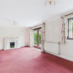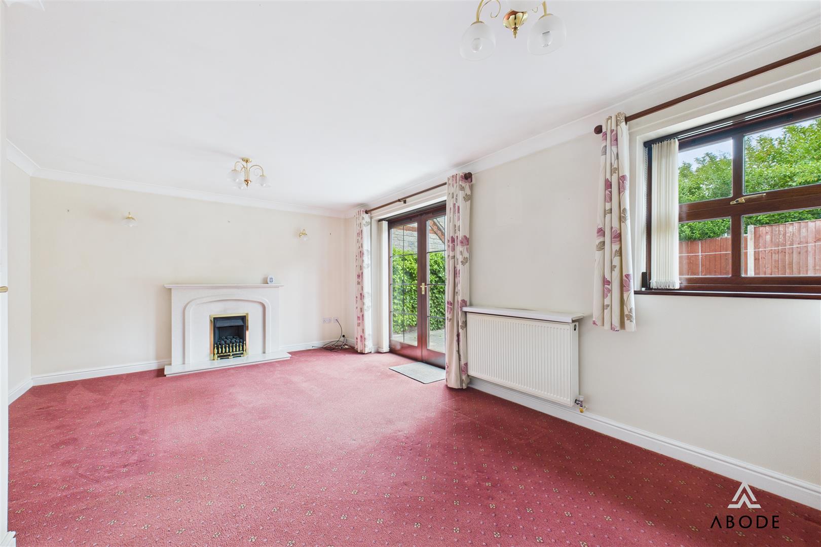A spacious and inviting living area featuring a focal-point gas fireplace with surround. The room benefits from a double-glazed window and double patio doors to the rear, opening onto the garden patio. Additional features include a central heating radiator and TV aerial point.