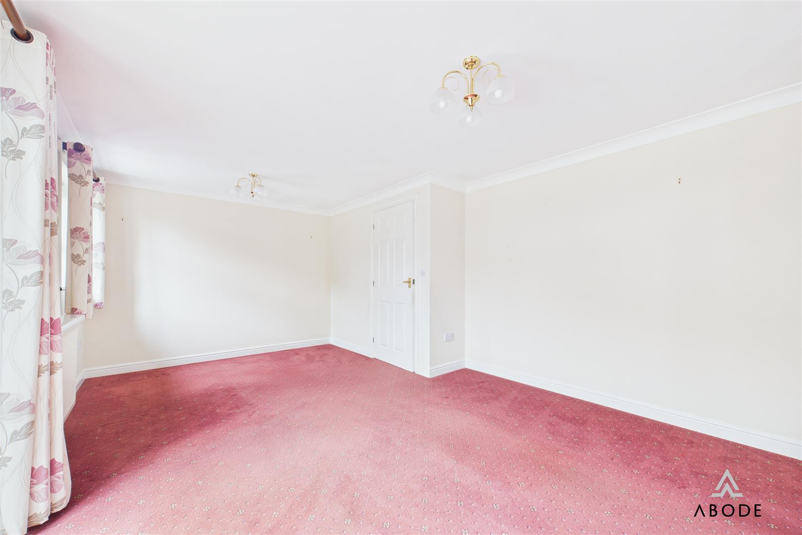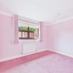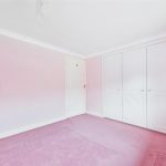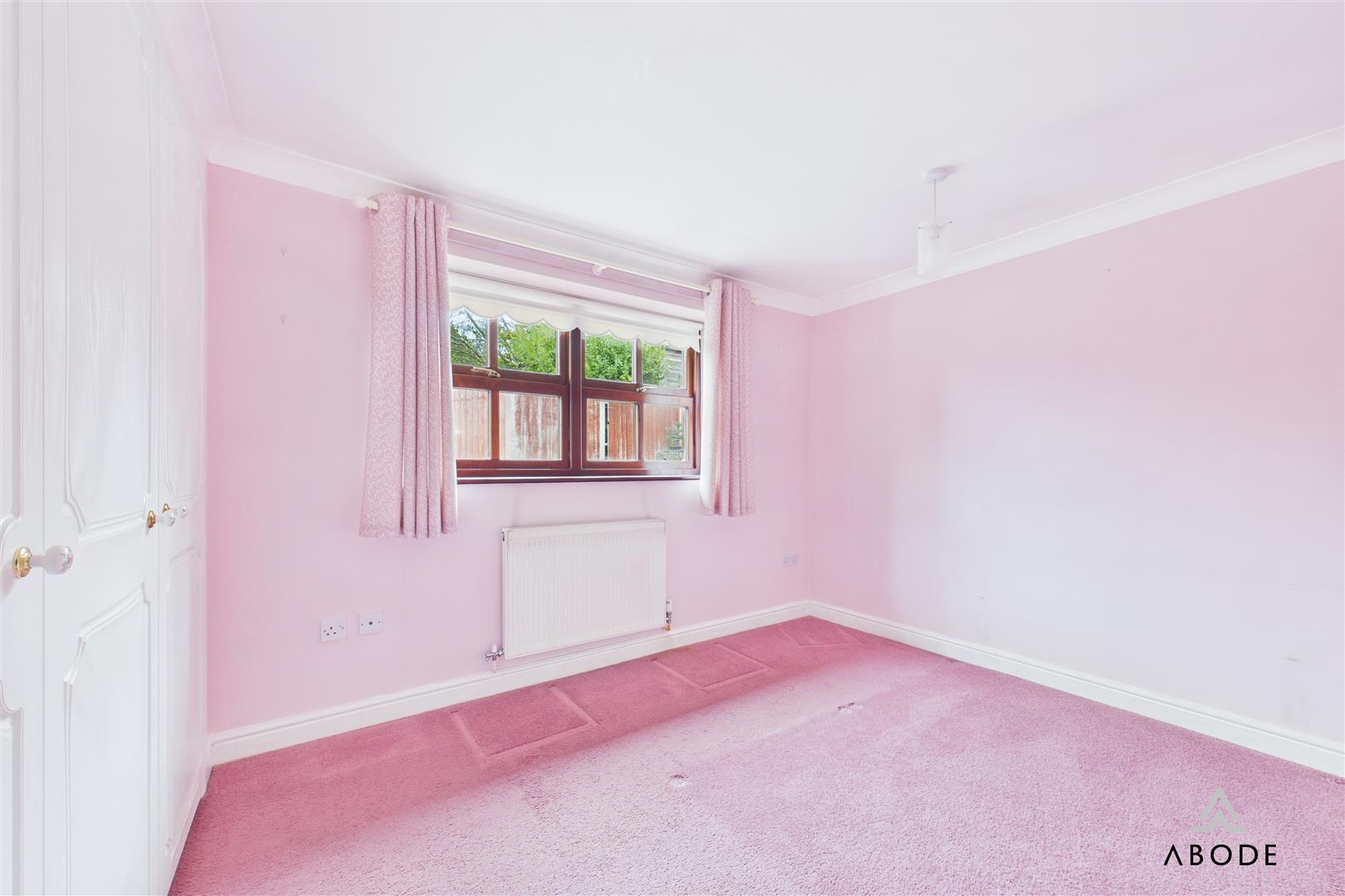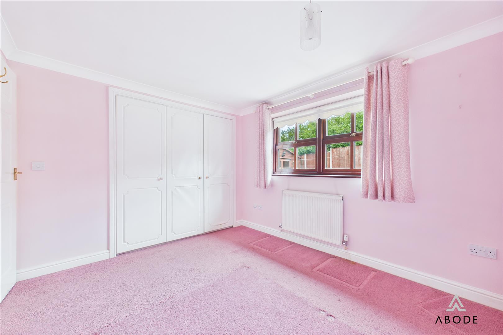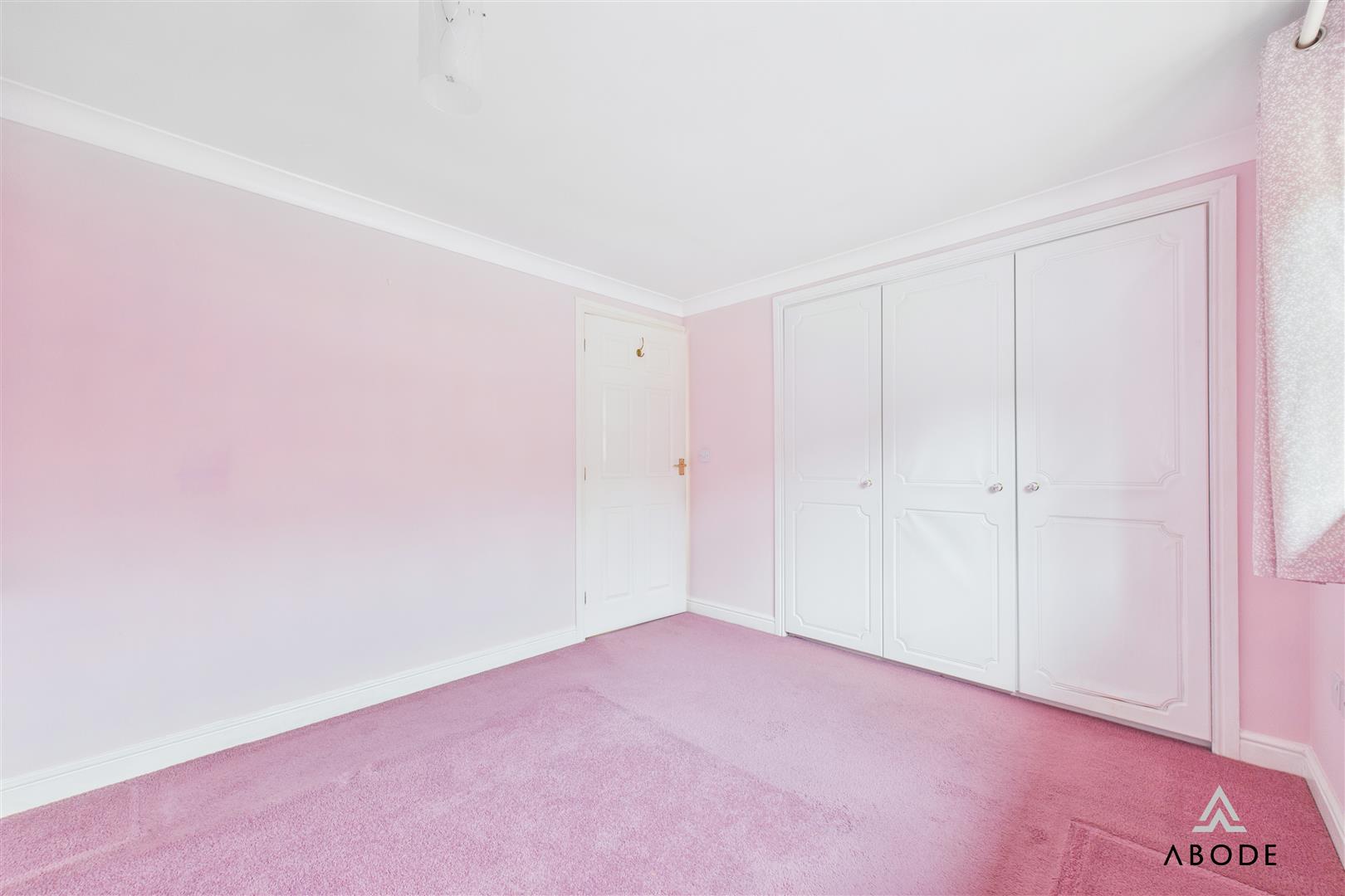 A bright second bedroom with a UPVC double-glazed window to the front elevation, central heating radiator, and built-in wardrobe with eye-level shelving.