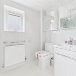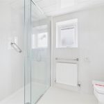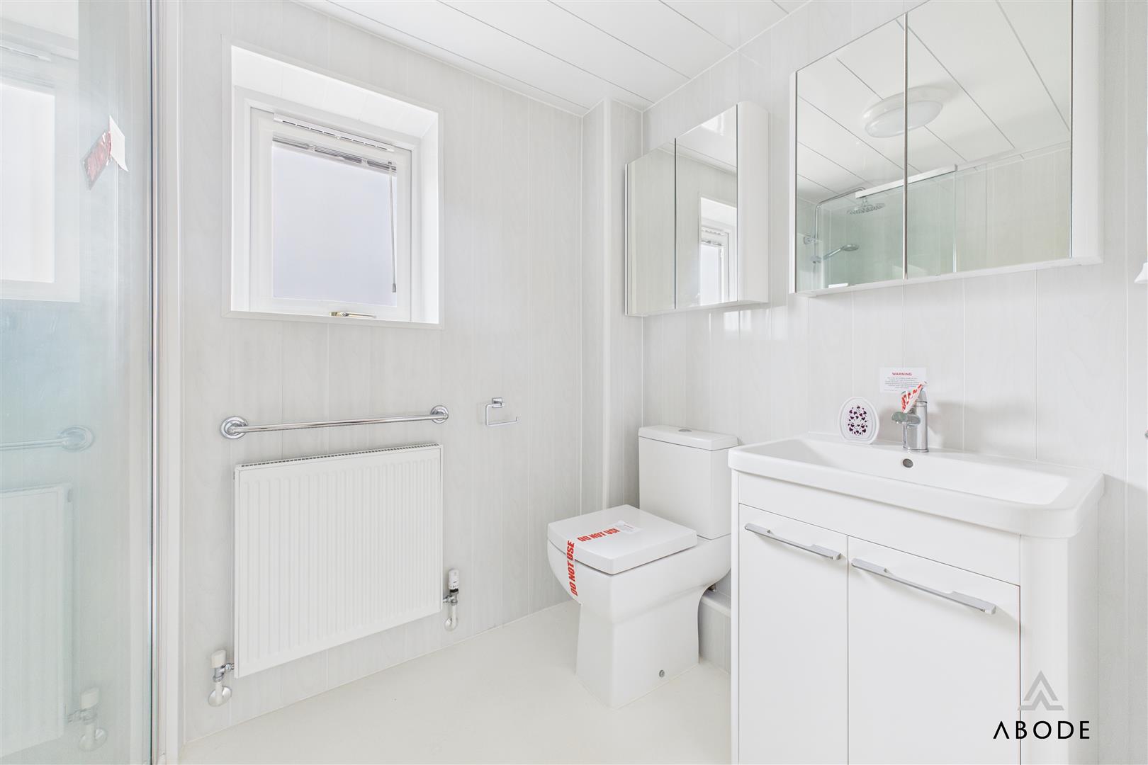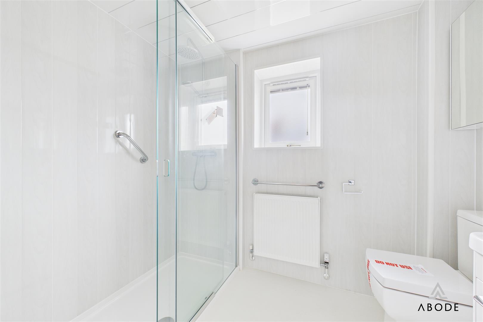 Modern three-piece shower suite comprising a low-level WC, wash hand basin with mixer tap, and double shower cubicle with waterfall showerhead. The room includes UPVC frosted double-glazed window to the front elevation and PVC panelled wall coverings.
