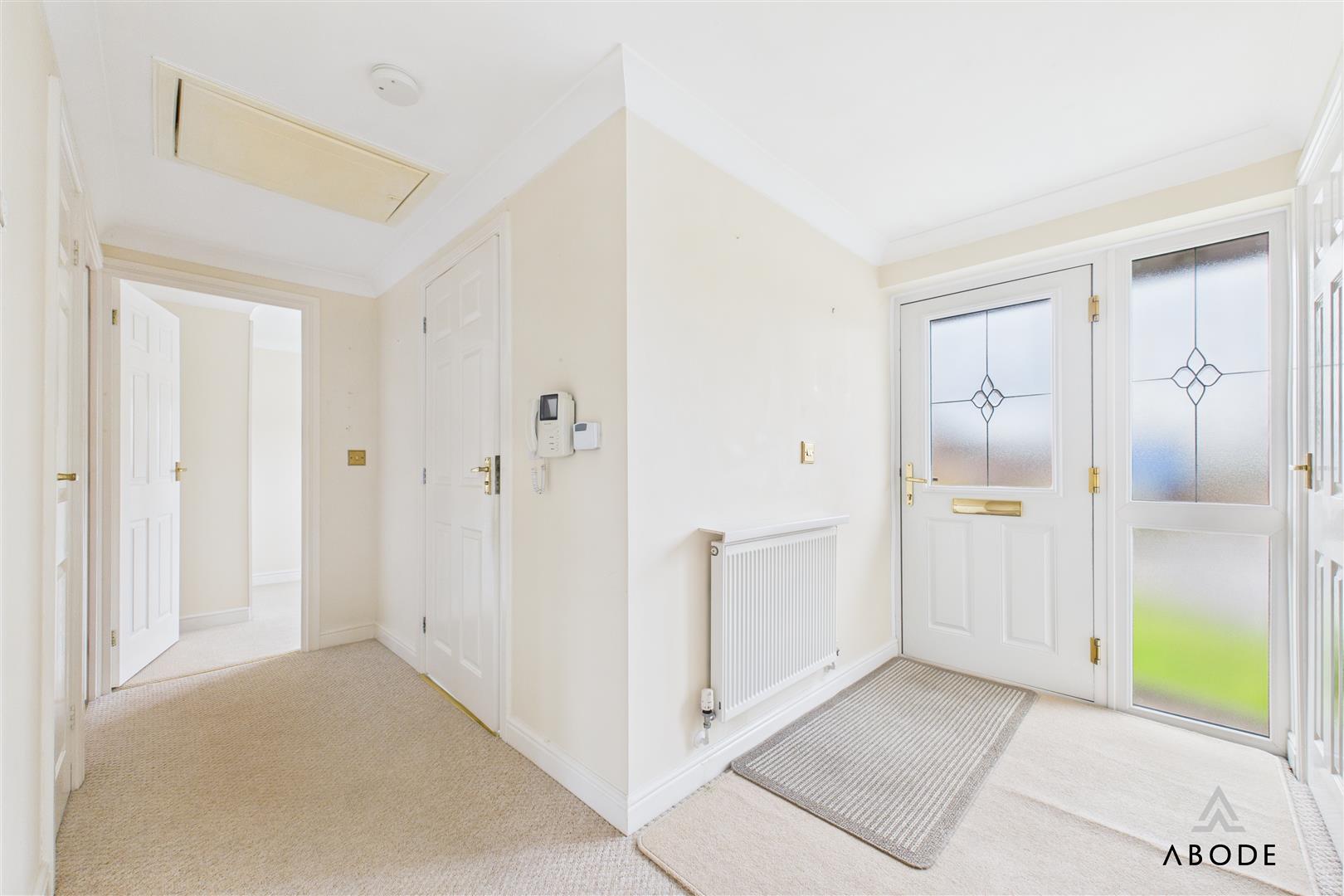 A welcoming entrance featuring a composite front door with adjoining UPVC double-glazed frosted window. The hallway includes a central heating radiator with thermostat, intercom telephone system, loft access via hatch, a useful storage cupboard, and a separate boiler cupboard housing the central heating gas boiler. Internal doors lead to the main rooms of the property.
