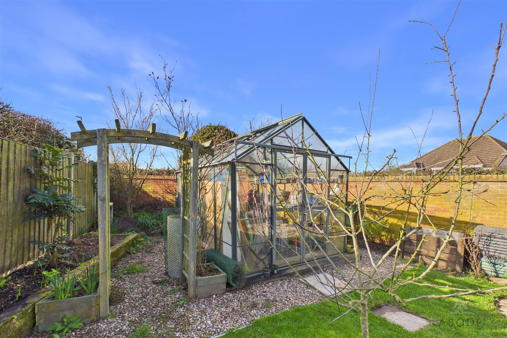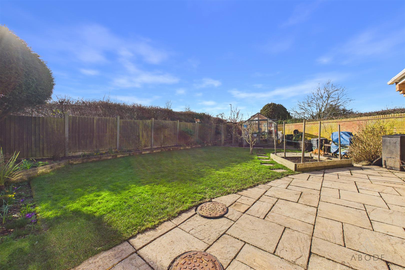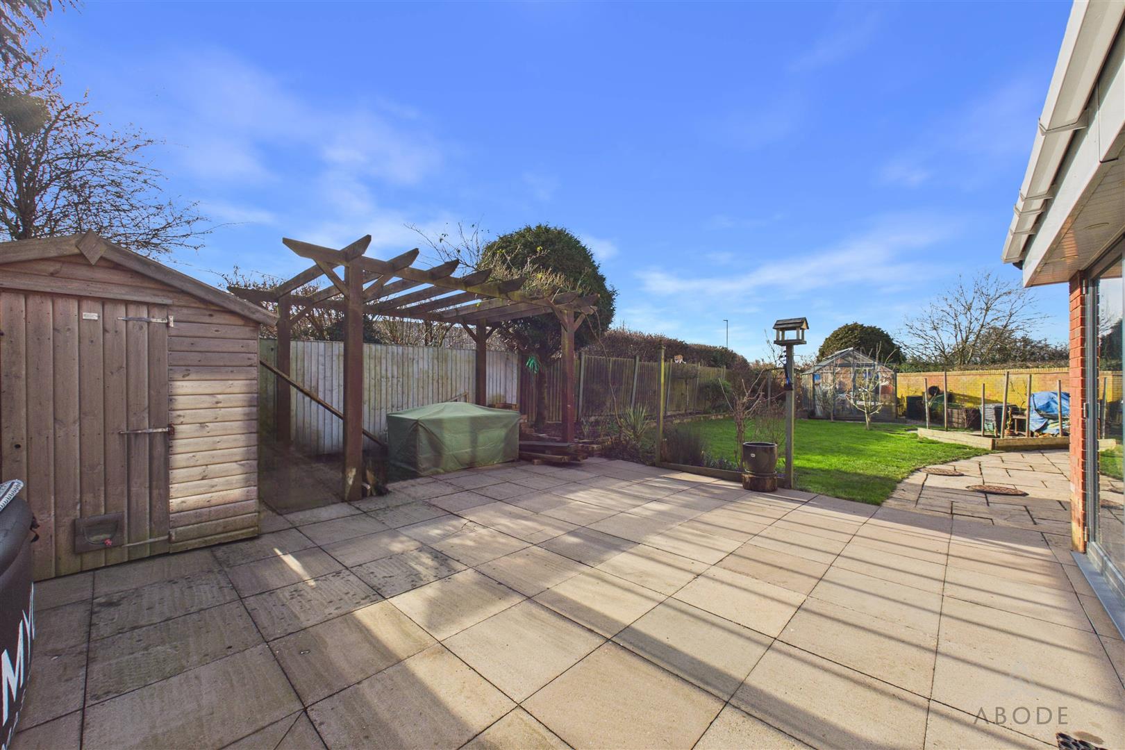 The rear garden enjoys a desirable south-facing aspect and features an Indian stone paved patio, ideal for relaxing and outdoor seating. A second stone patio provides an excellent space for al fresco dining, complemented by a timber pergola. The garden is attractively enclosed by timber fence panels and concrete posts, with well-stocked herbaceous borders, mature planting and established trees offering a high degree of privacy. The majority of the garden is laid to lawn, and there is also a part-walled boundary to the front section.