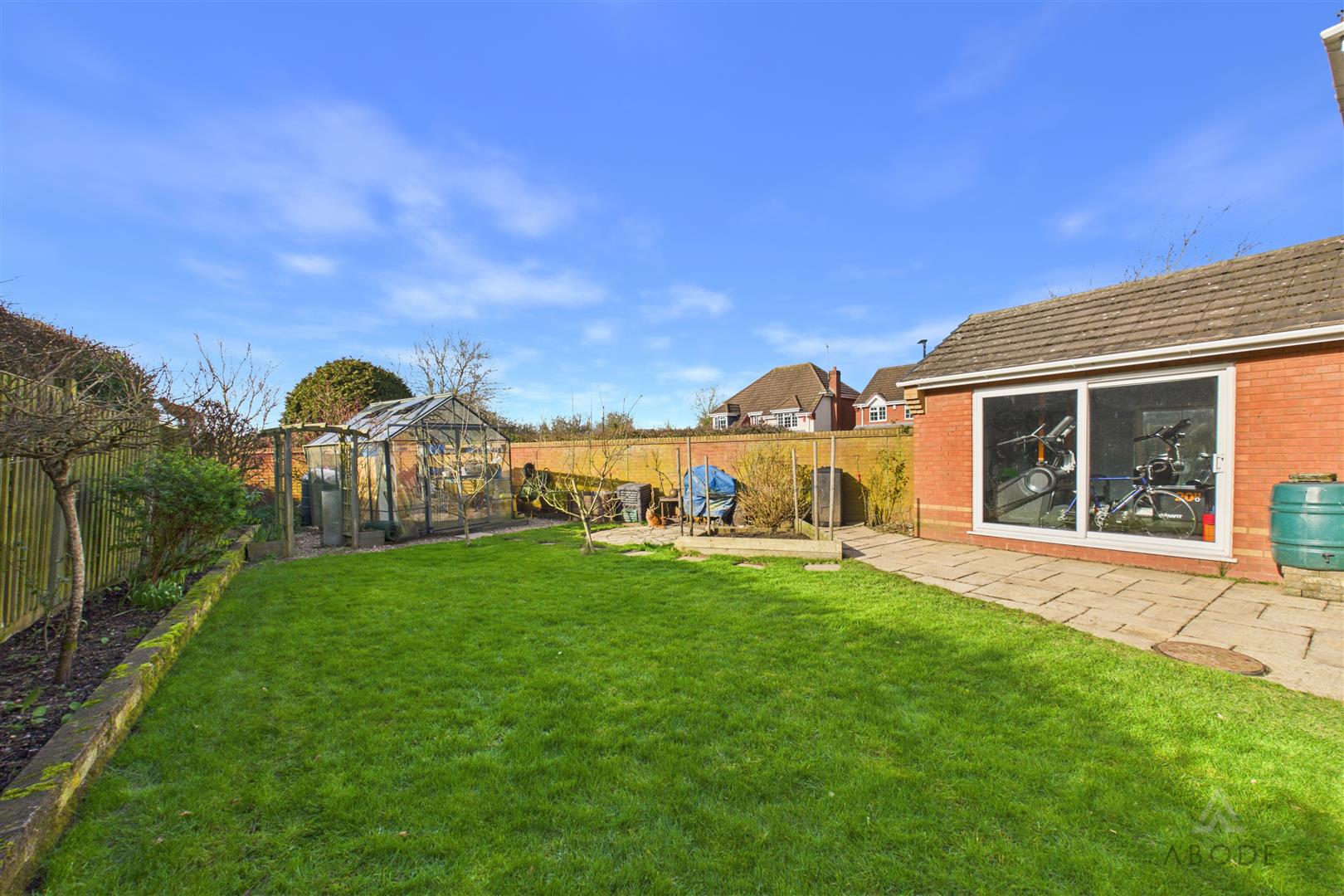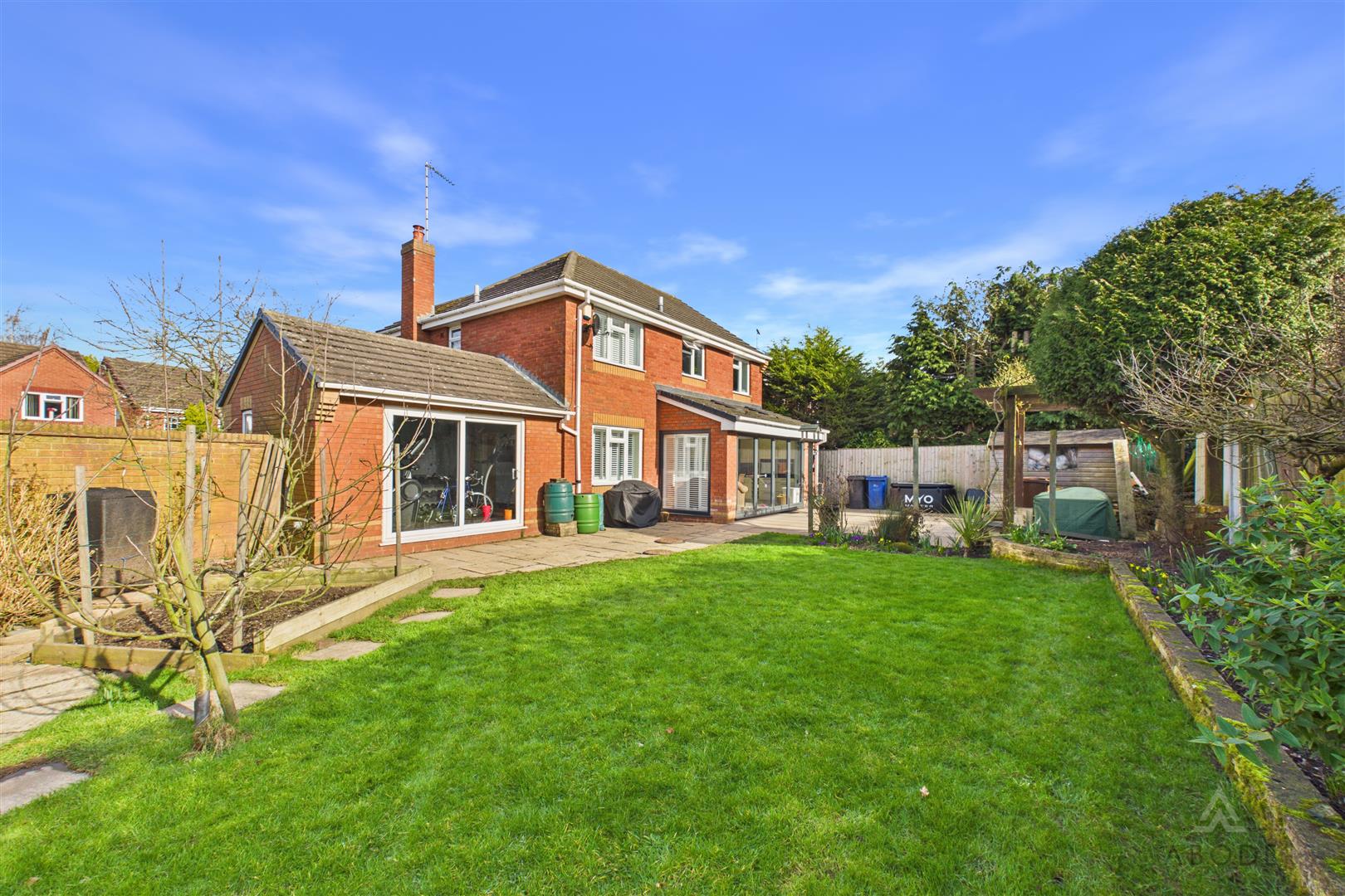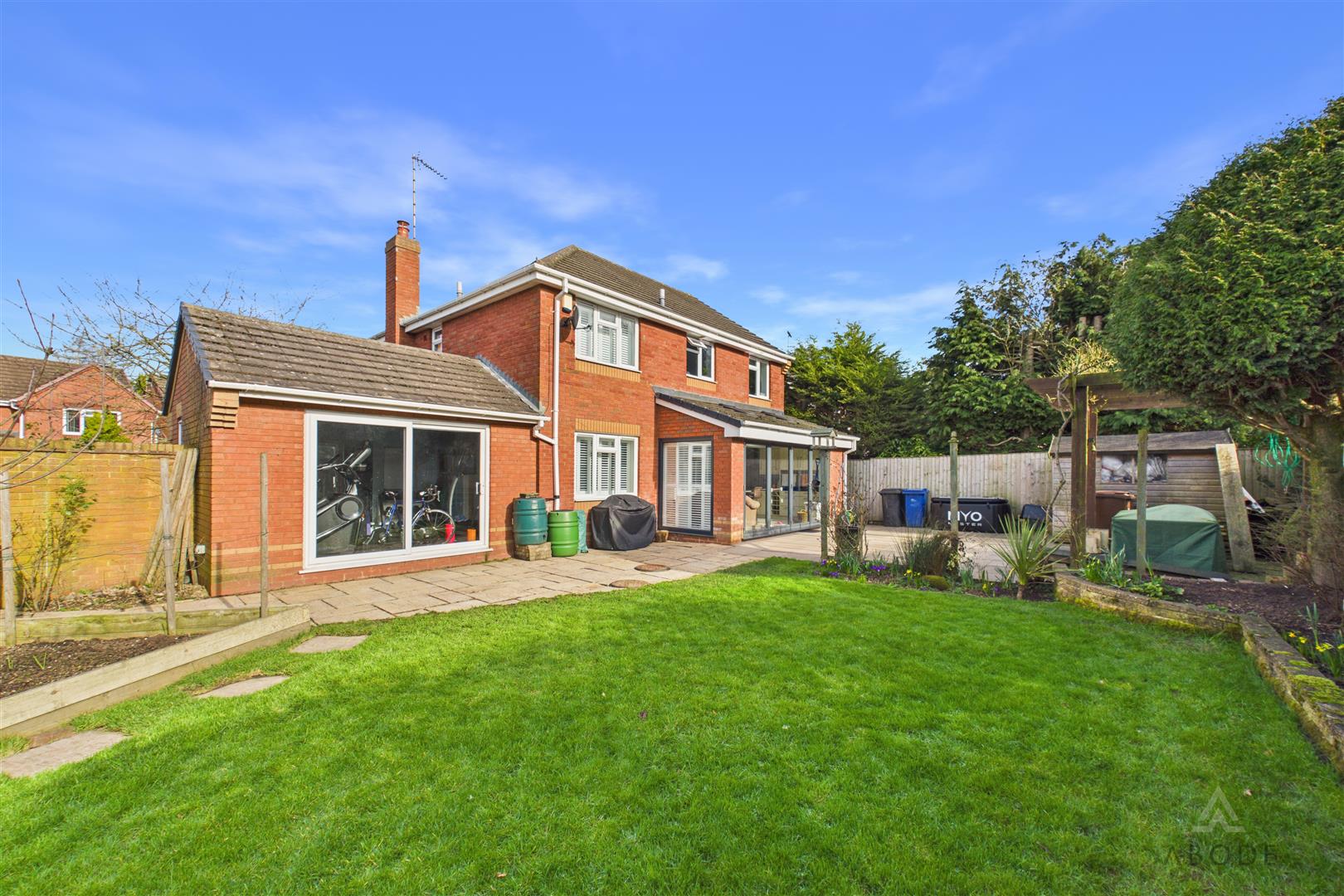 The rear garden enjoys a desirable south-facing aspect and features an Indian stone paved patio, ideal for relaxing and outdoor seating. A second stone patio provides an excellent space for al fresco dining, complemented by a timber pergola. The garden is attractively enclosed by timber fence panels and concrete posts, with well-stocked herbaceous borders, mature planting and established trees offering a high degree of privacy. The majority of the garden is laid to lawn, and there is also a part-walled boundary to the front section.