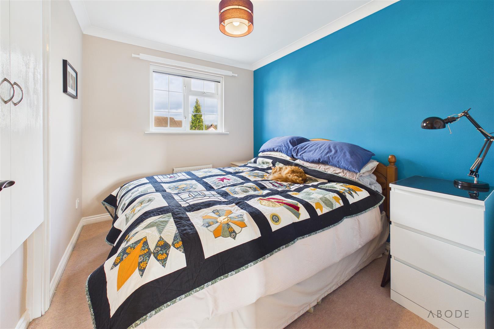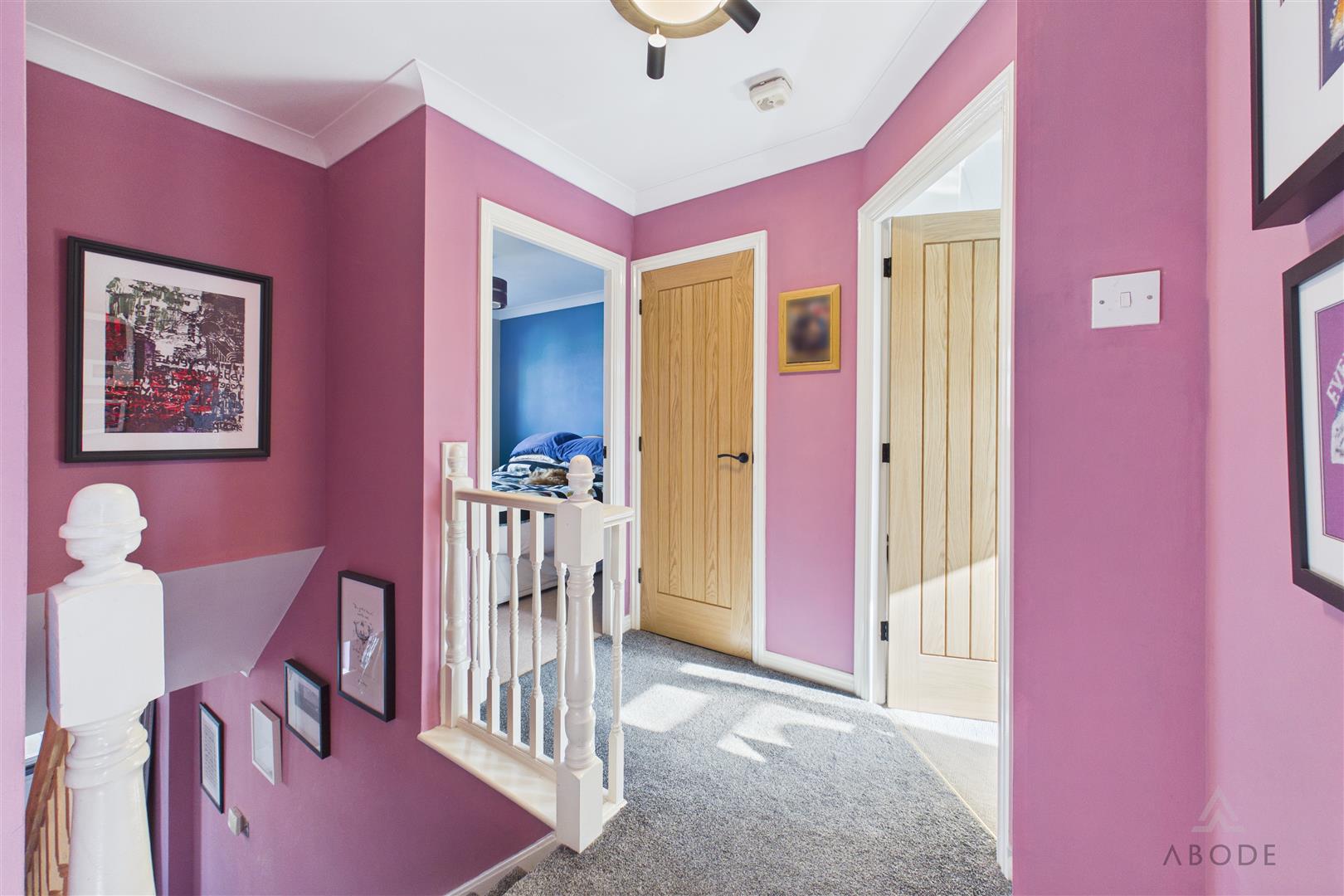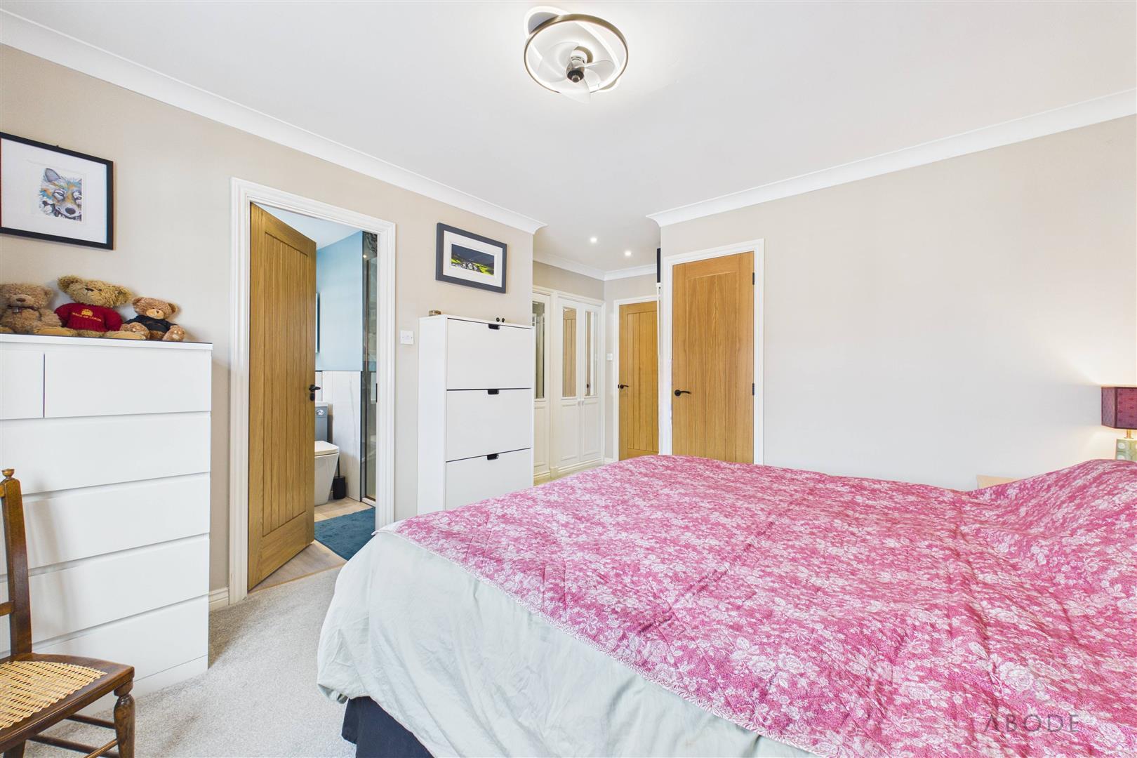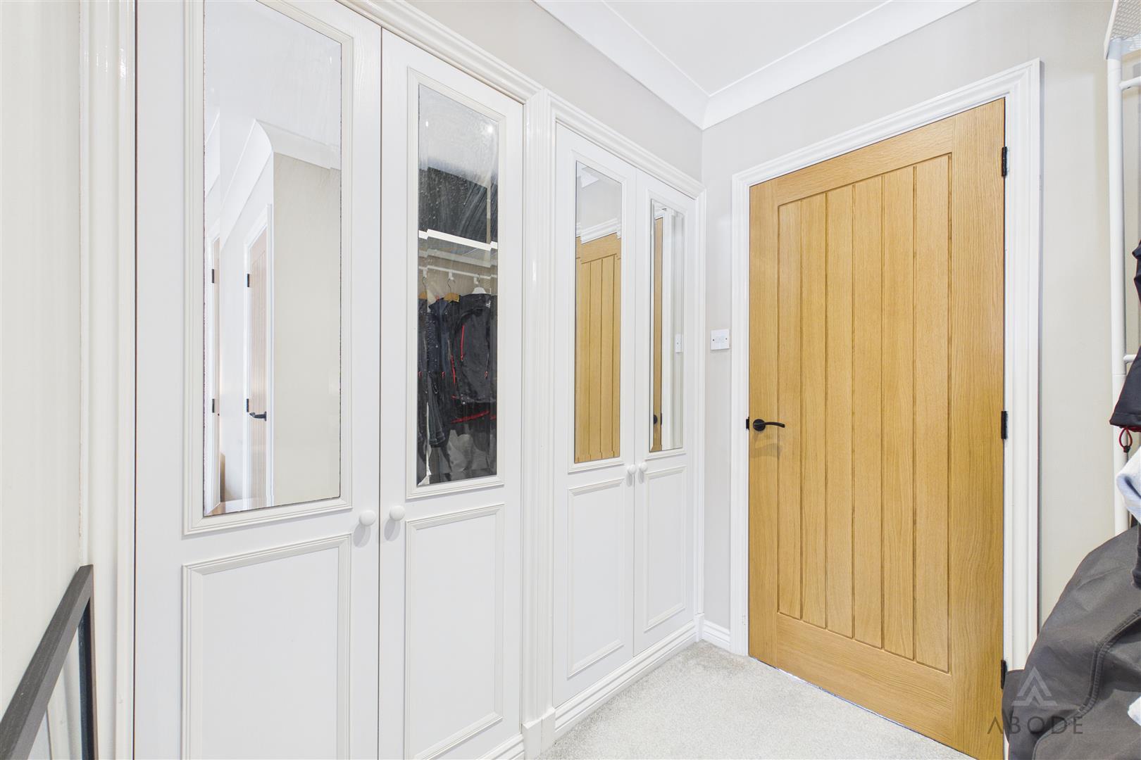 The landing provides access to the loft via a hatch with pull-down ladder; the loft is fully boarded, offering excellent additional storage. An integrated storage cupboard with shelving is also located on the landing. Doors lead to: