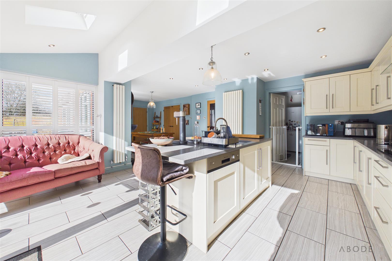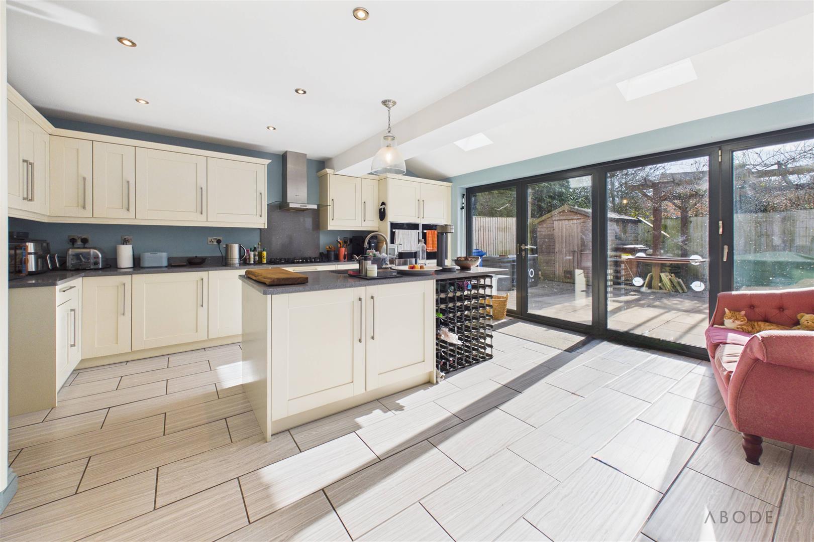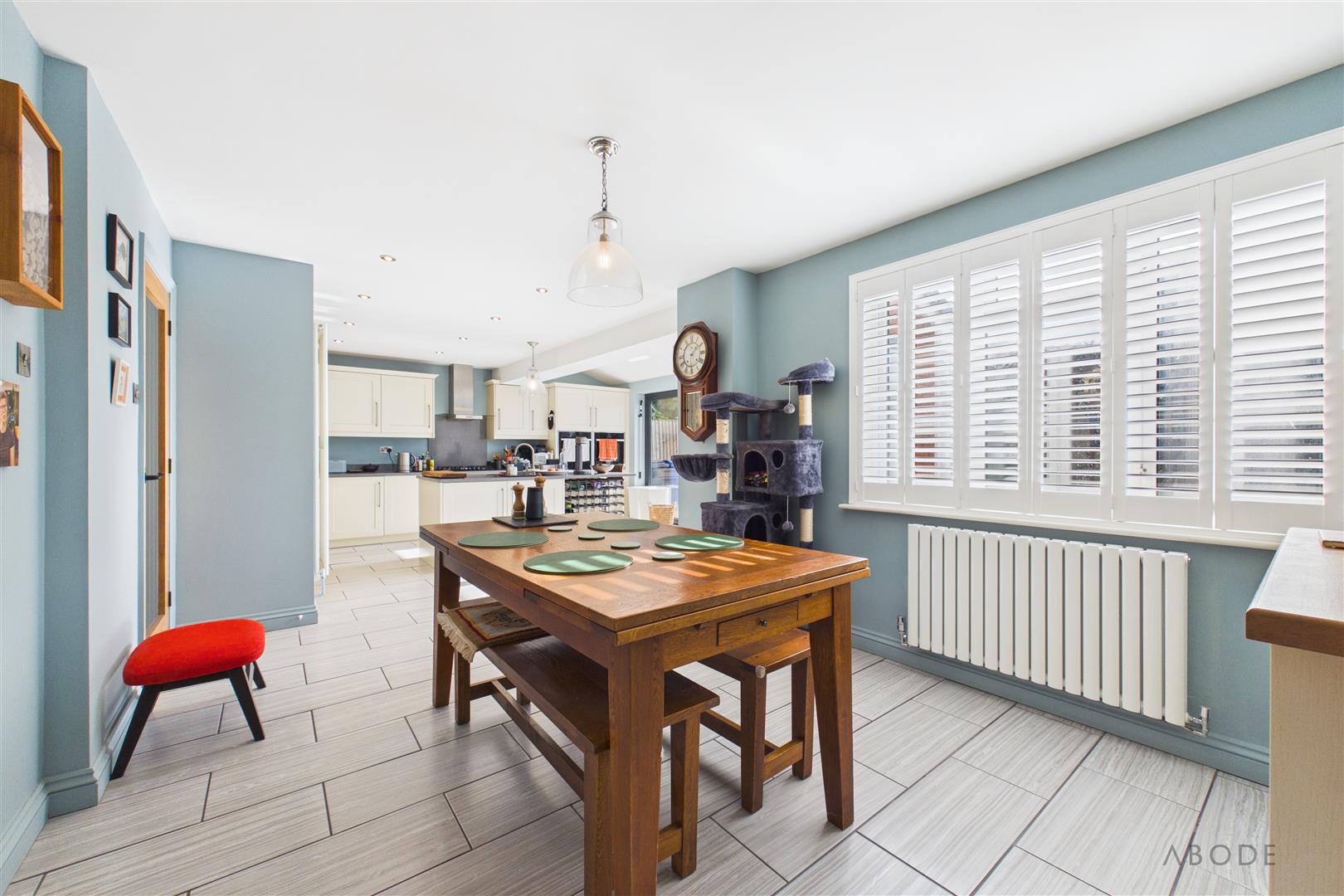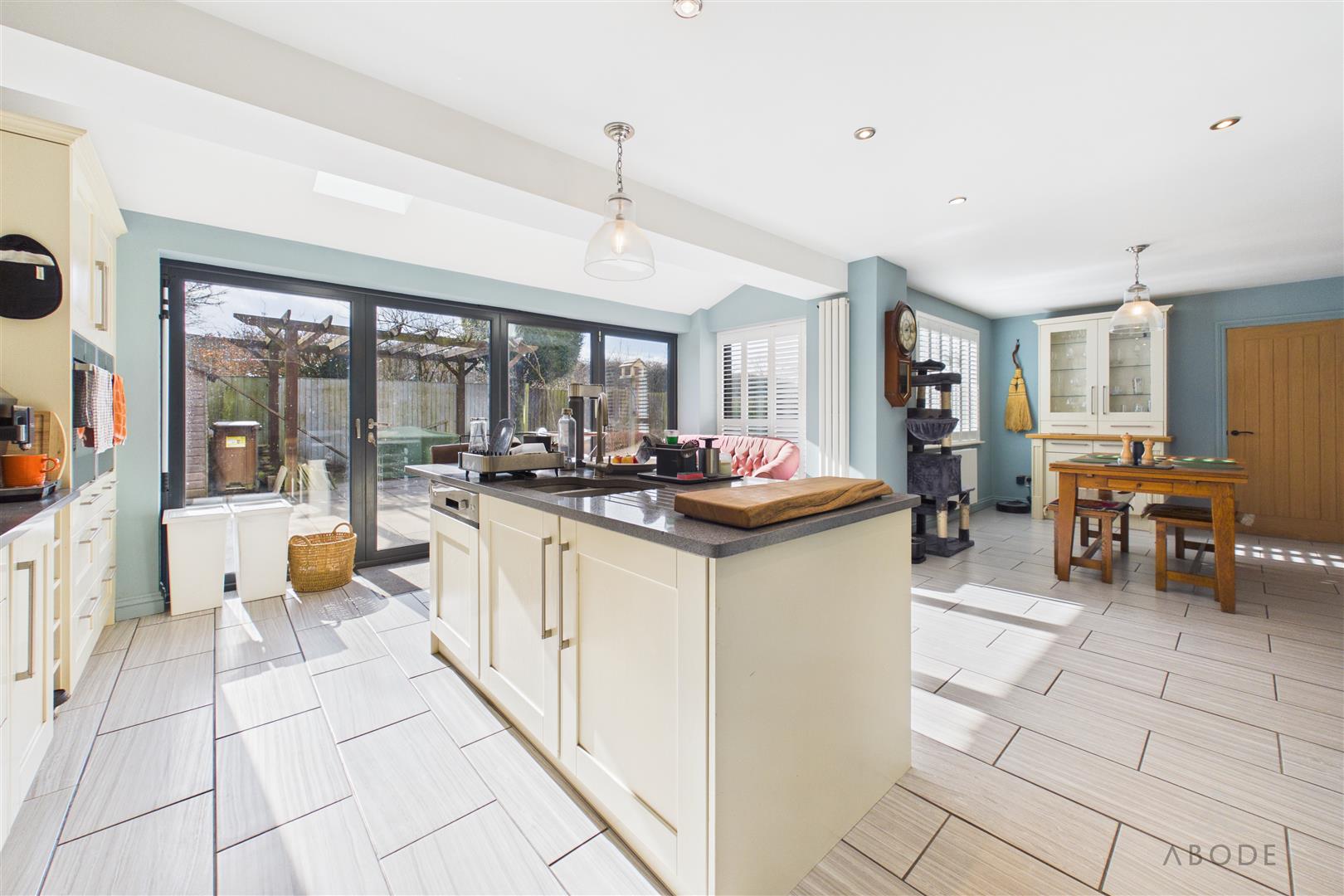 Undoubtedly the heart of the home, this impressive open-plan living dining kitchen has been thoughtfully extended to create a superb family and entertaining space. Flooded with natural light from two uPVC double glazed windows to the rear and side elevations with fitted shutter blinds, the space is further enhanced by anthracite uPVC bi-folding doors and additional ceiling windows, seamlessly connecting the indoors with the garden.