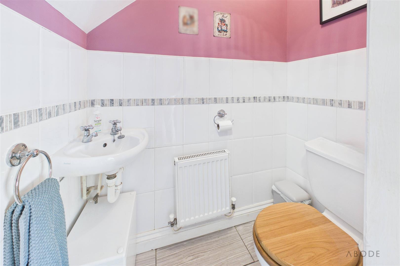 Appointed with a low-level WC and a contemporary corner floating wash hand basin with complementary tiling to both floor and part walls. Additional features include a central heating radiator and extractor fan.