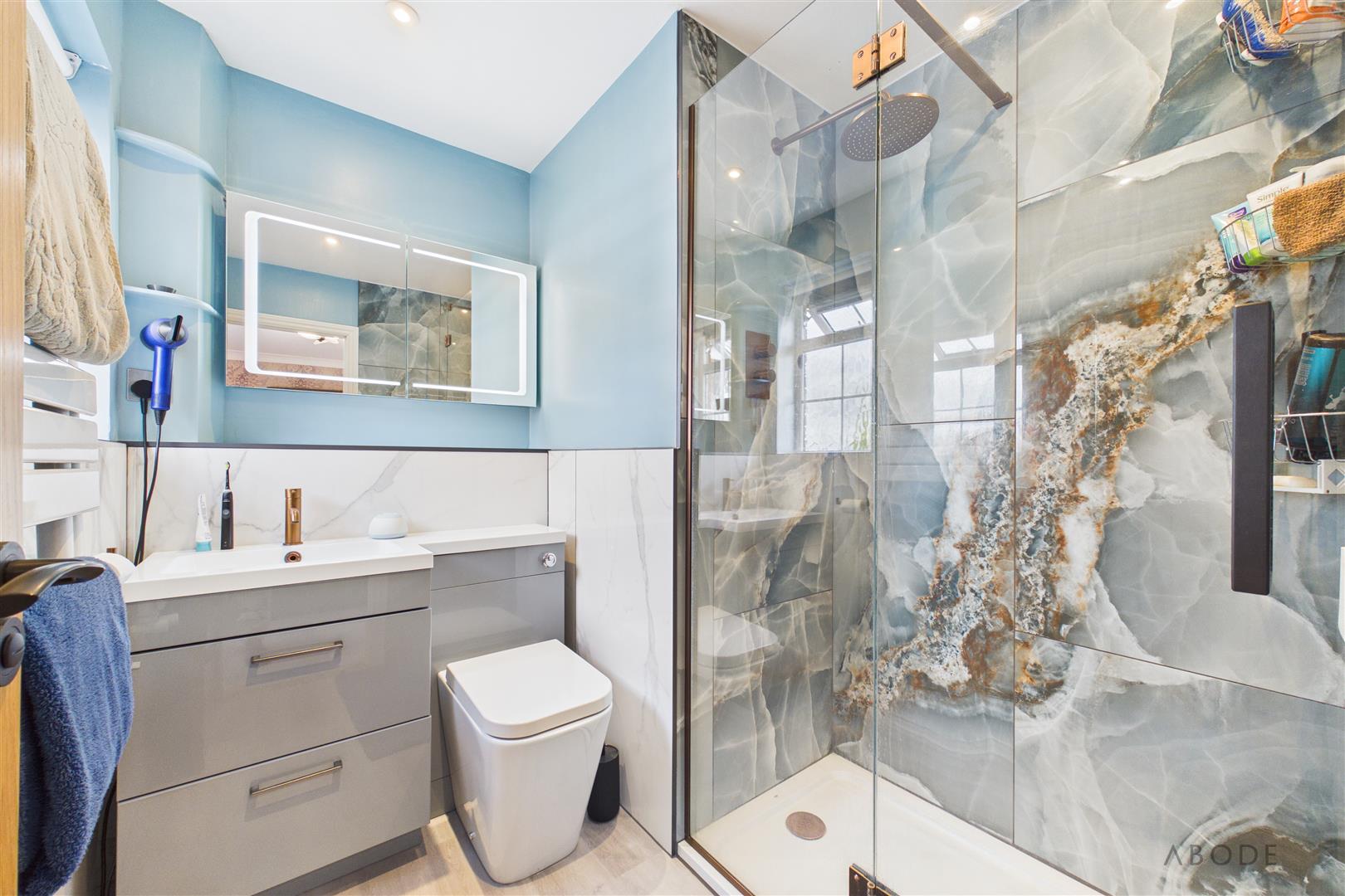 Comprising a modern three-piece suite including a low-level WC, vanity wash hand basin with mixer tap, and double shower cubicle with waterfall shower head. Complementary wall tiling, ceiling spotlights, heated towel radiator, extractor fan and a uPVC double glazed frosted window to the front elevation complete the space.