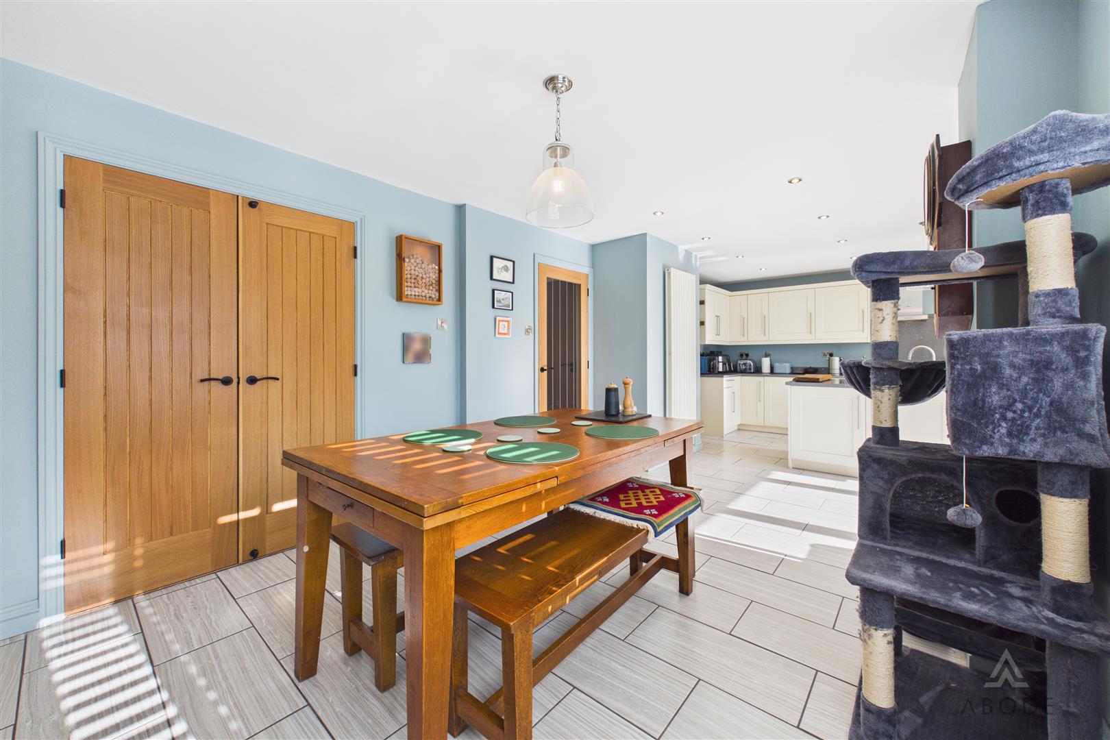 With a uPVC double glazed window to the side elevation and matching tiled flooring, the utility room provides additional preparation space with work surfaces, storage cupboards and space for freestanding and under-counter appliances. It also houses the electrical consumer unit and an integrated cupboard containing the central heating combination boiler.