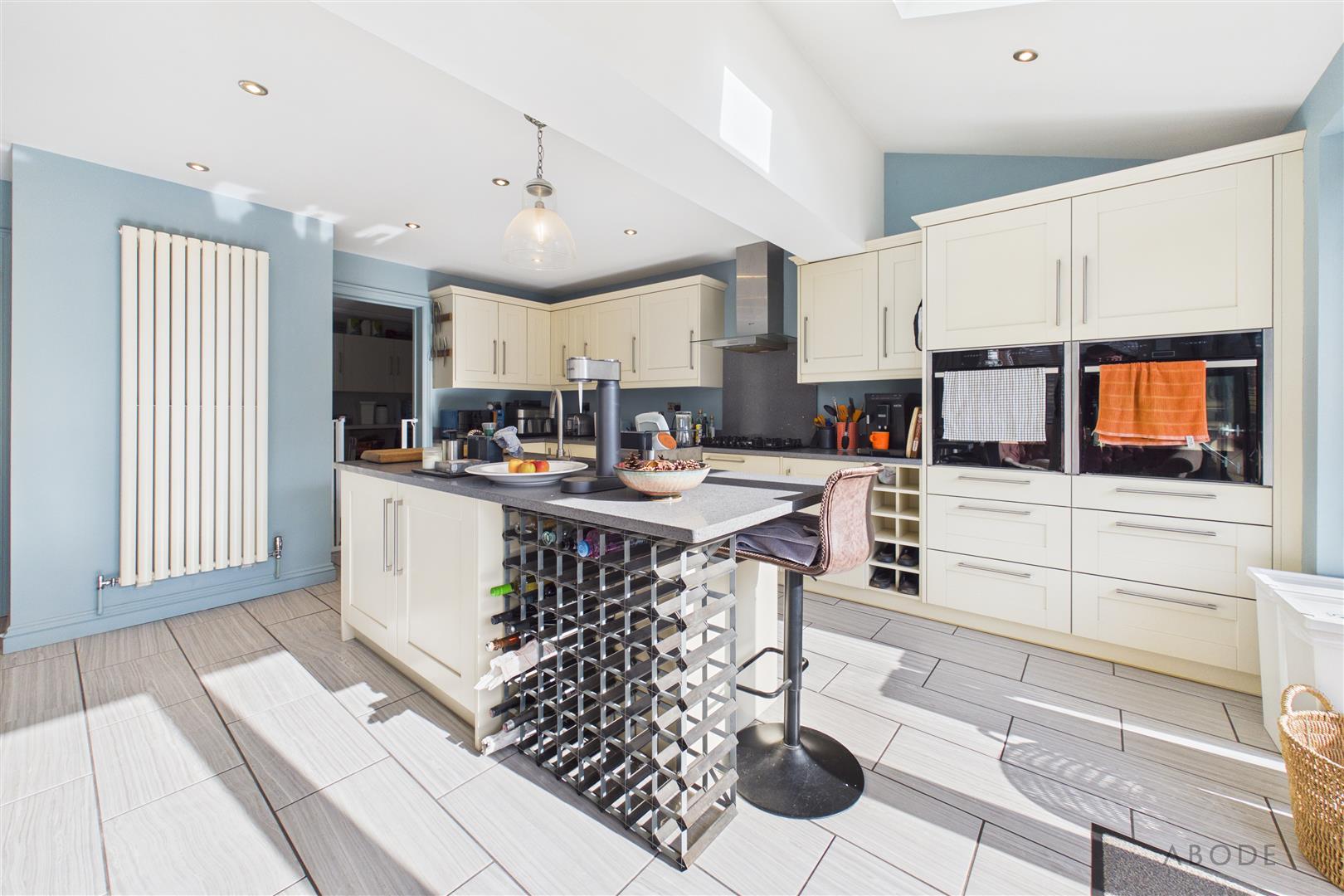 The bespoke kitchen is centred around a stunning breakfast island with granite work surfaces, base level storage cupboards, integrated washing machine, and a stainless steel sink with inset drainer and mixer tap. A five-ring Neff gas hob with matching stainless steel extractor hood, double ovens with hide-and-slide doors, and a comprehensive range of matching base and eye-level units and drawers complete the space. Spotlighting to the ceiling, complementary tiled flooring and a central heating radiator add the finishing touches. An internal door leads to: