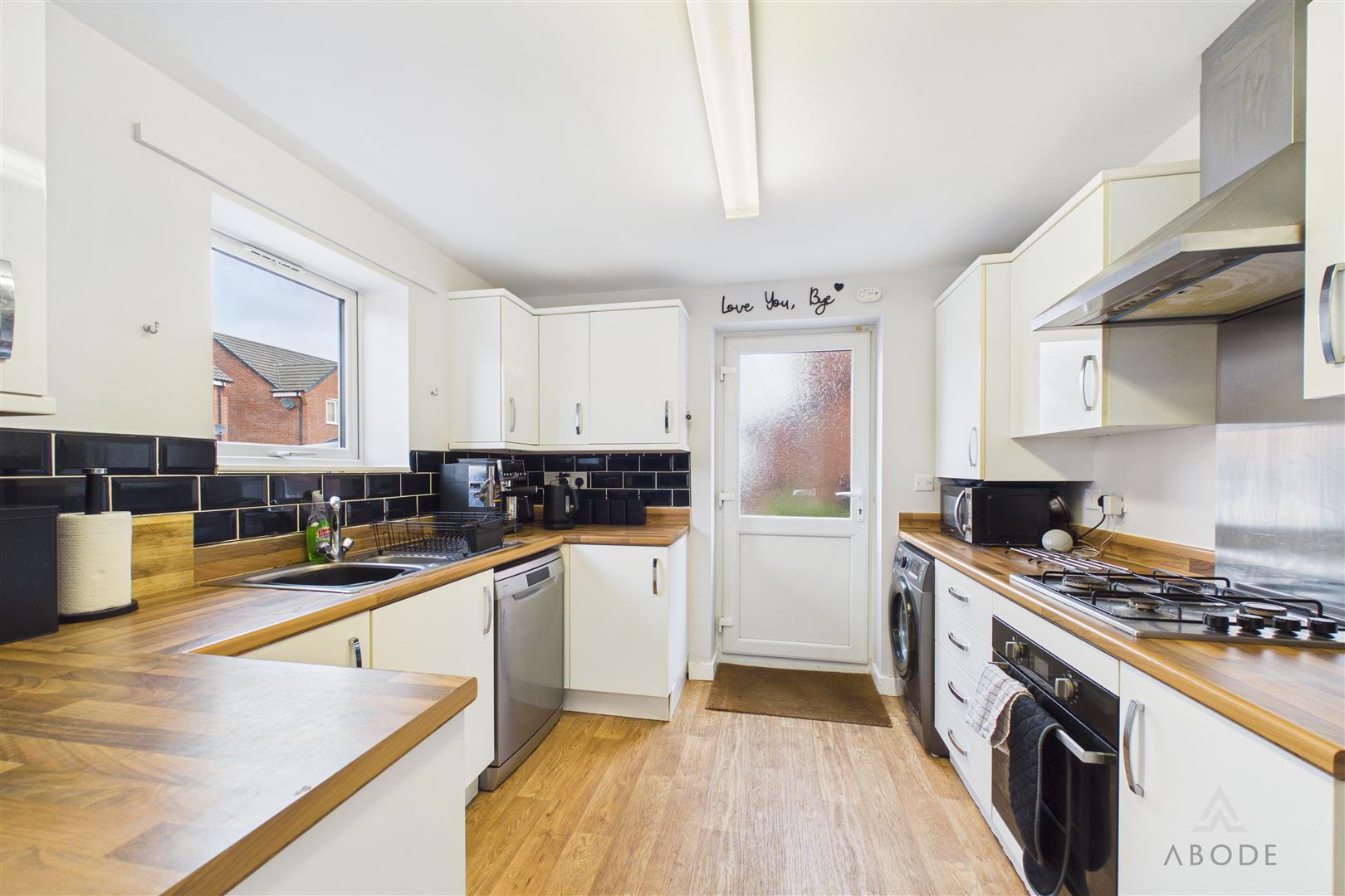 To the rear of the property, the open-plan kitchen diner provides a functional and sociable space. The kitchen is fitted with a range of matching wall and base units with work surfaces over, incorporating an integrated oven, gas hob with extractor above, and space for additional appliances. A door provides access to the side driveway, while the dining area benefits from windows to the front and side aspects.