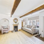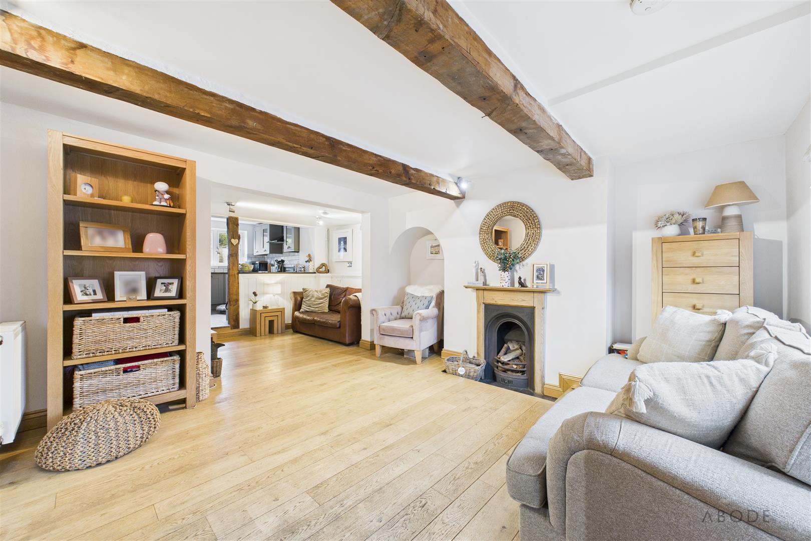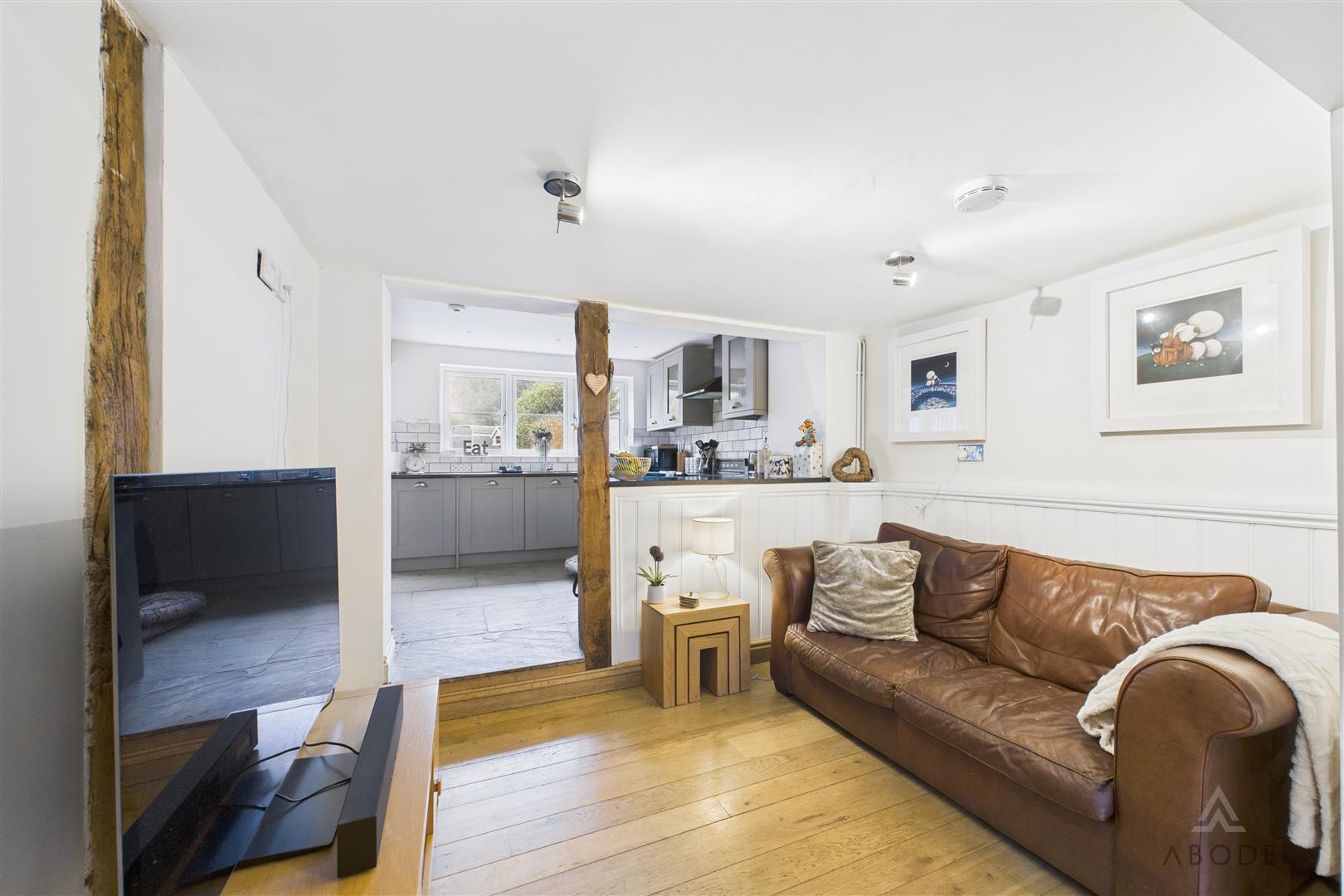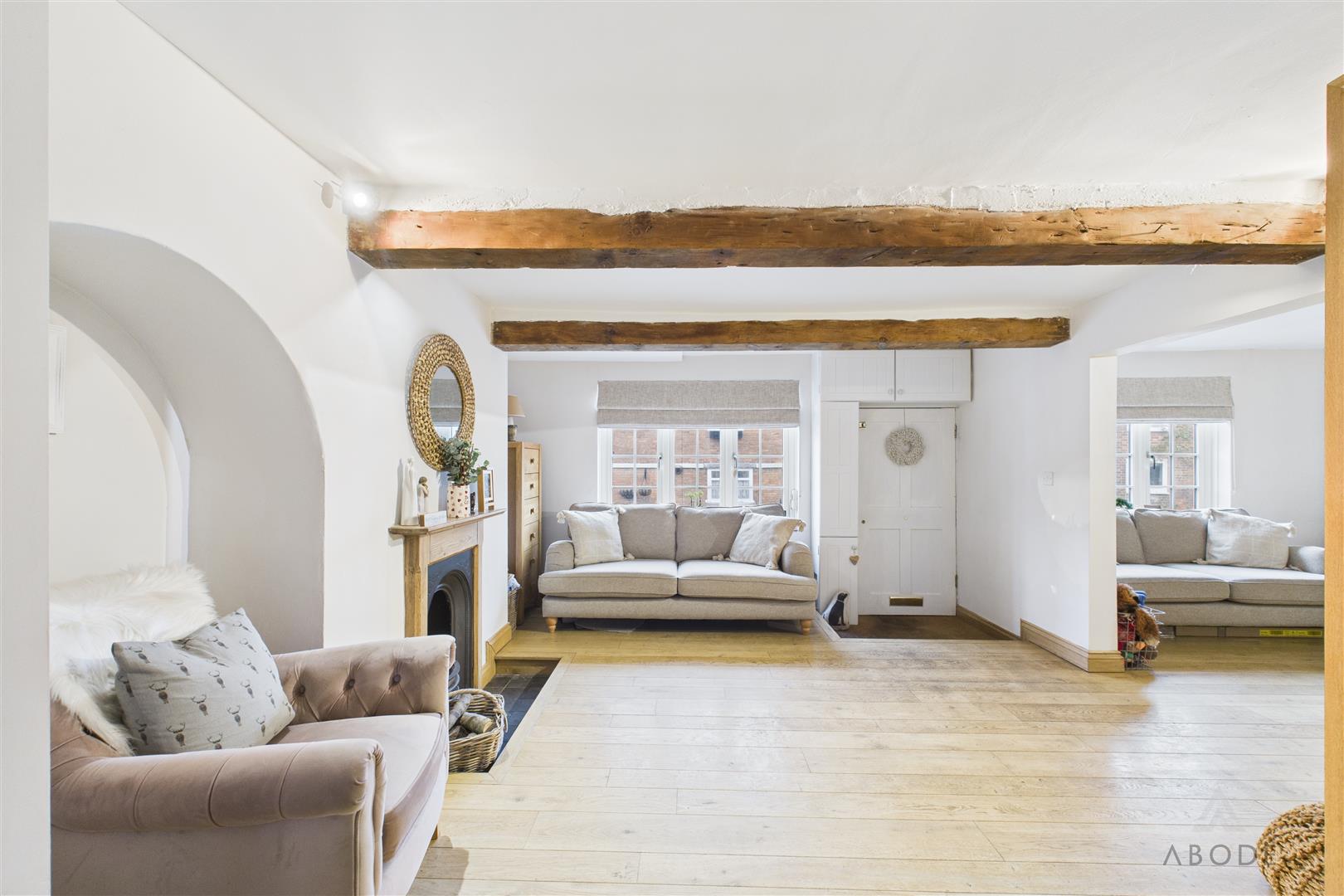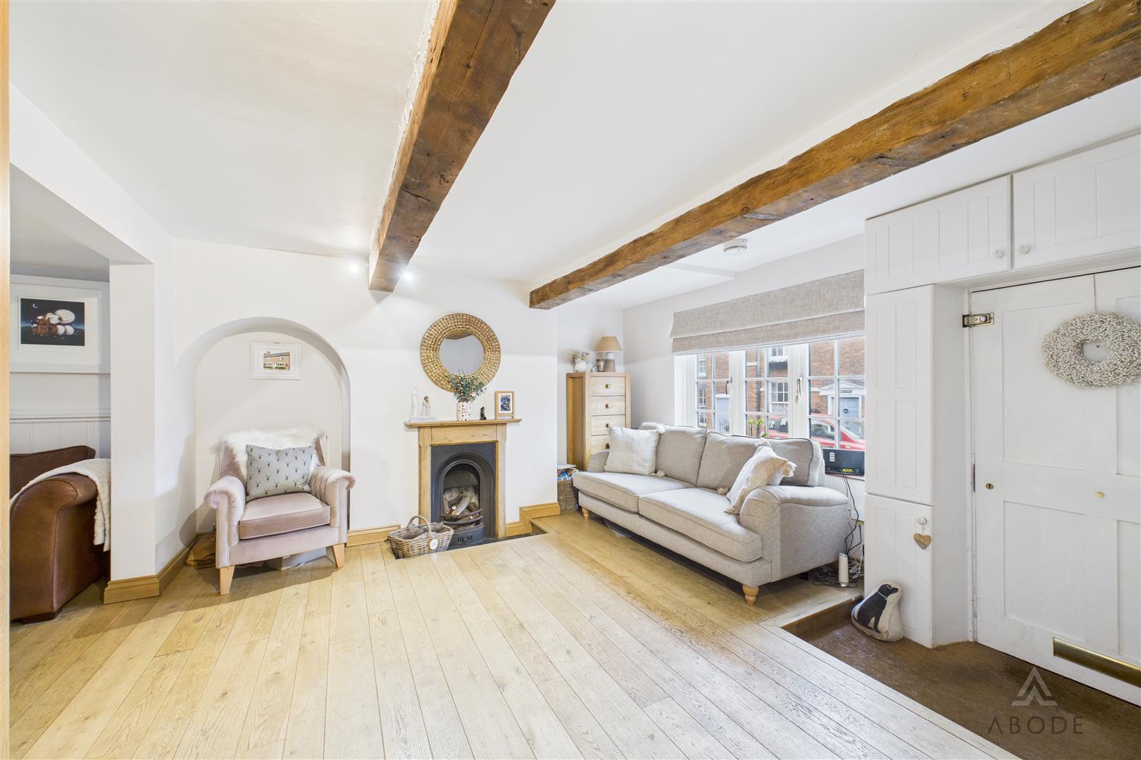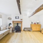 Double glazed window to the front elevation, wooden flooring, beams and fireplace with tiled hearth. Central heating radiator, storage cupboard and stairs leading up to the first floor.