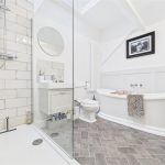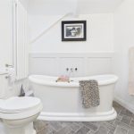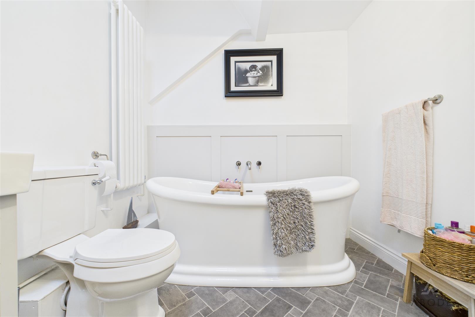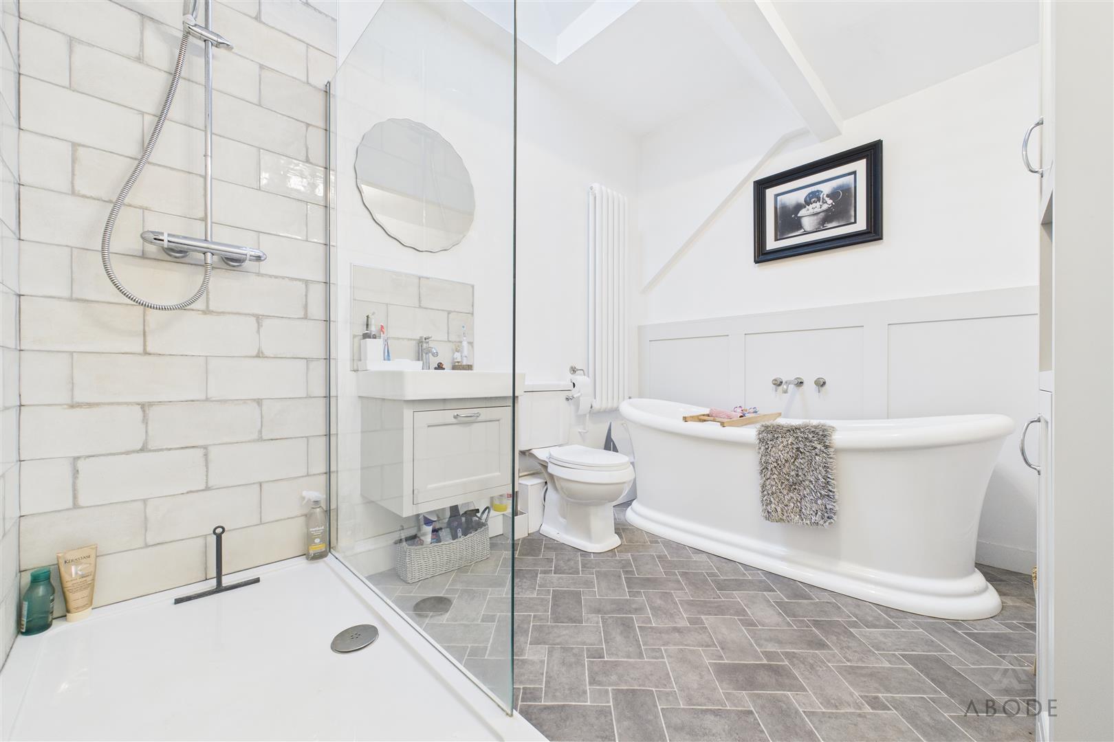 Roll top bath, WC, wash hand basin with storage cupboard below and tiled splash back, and double shower with glass screen, tiled walls and hand held and waterfall shower head over. Electrically controlled skylight, central heating radiator and panelling.