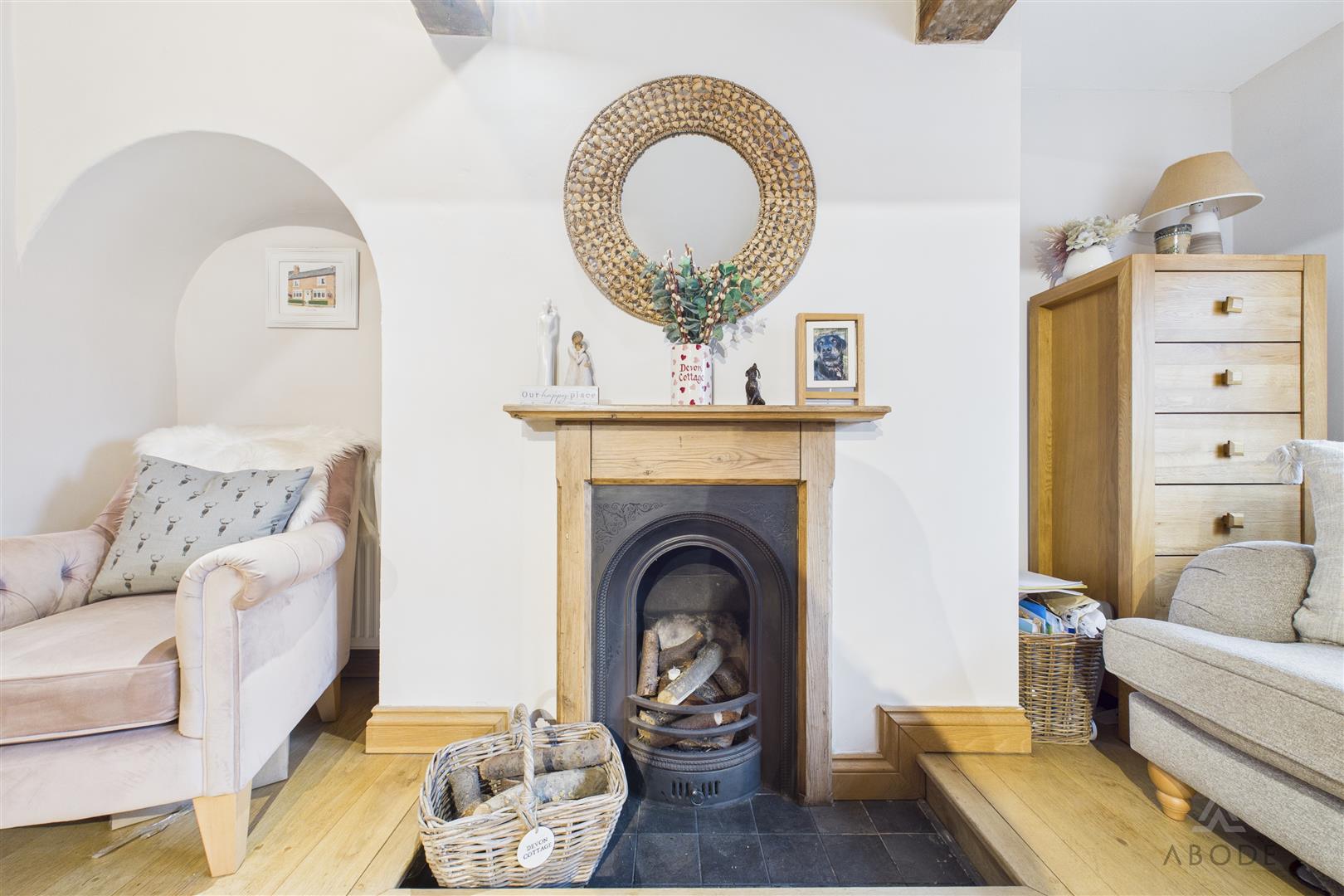 Double glazed window to the front elevation, door leading in from the front, grass mat, beams, central heating radiator and feature fireplace with tiled hearth.