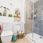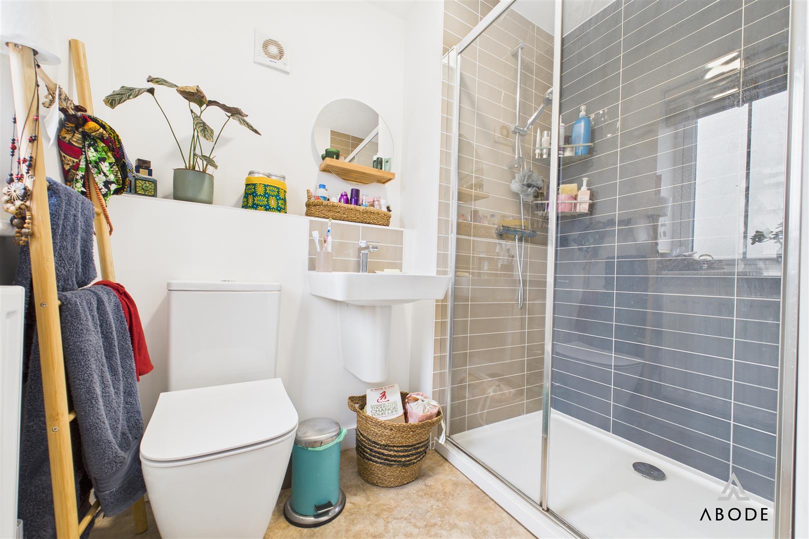 Modern suite comprising;- WC, wash hand basin and double shower cubicle with glass shower screen. Central heating radiator, partially tiled walls, UPVC double glazed window to the front elevation and extractor fan.