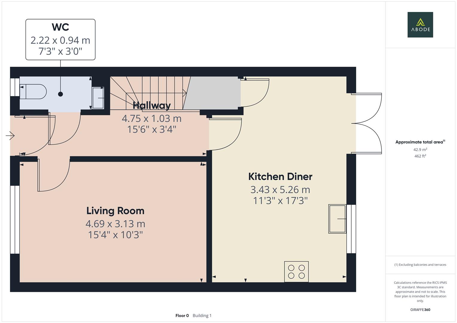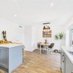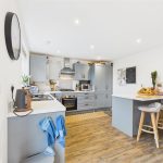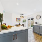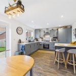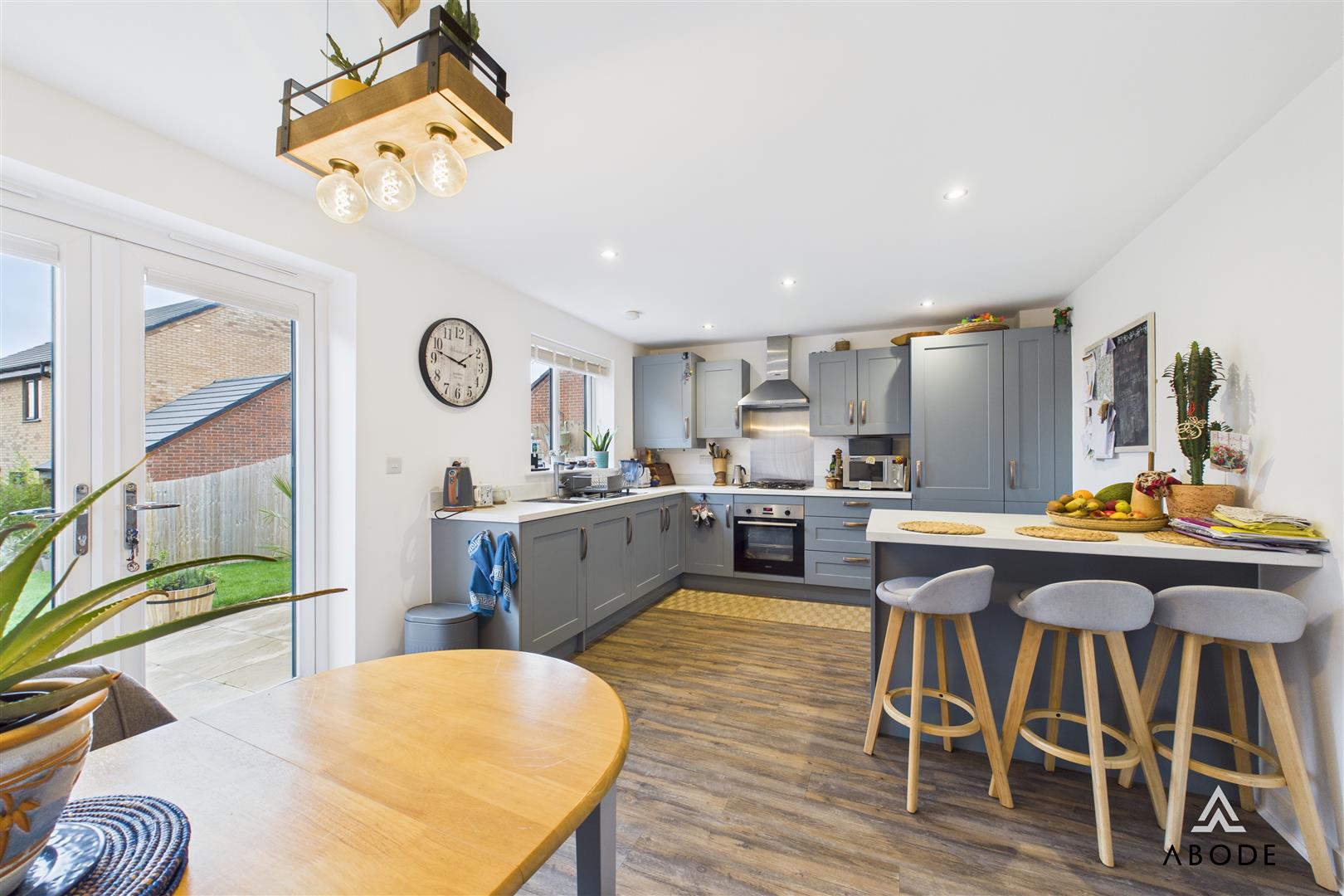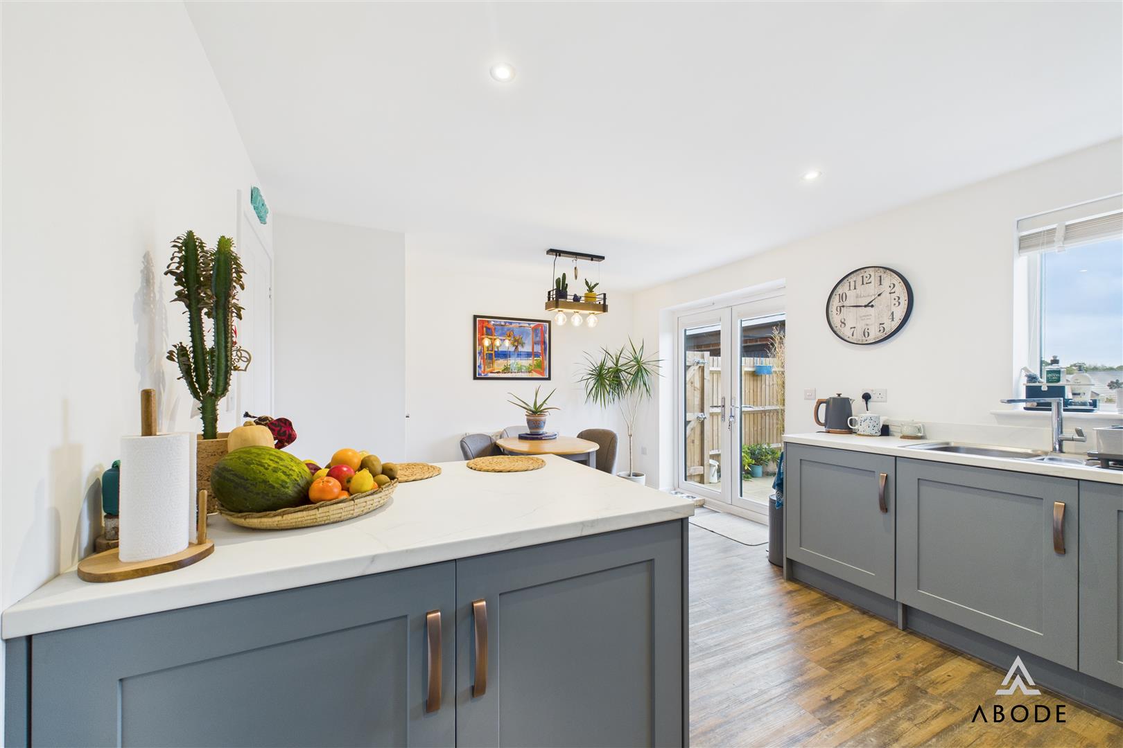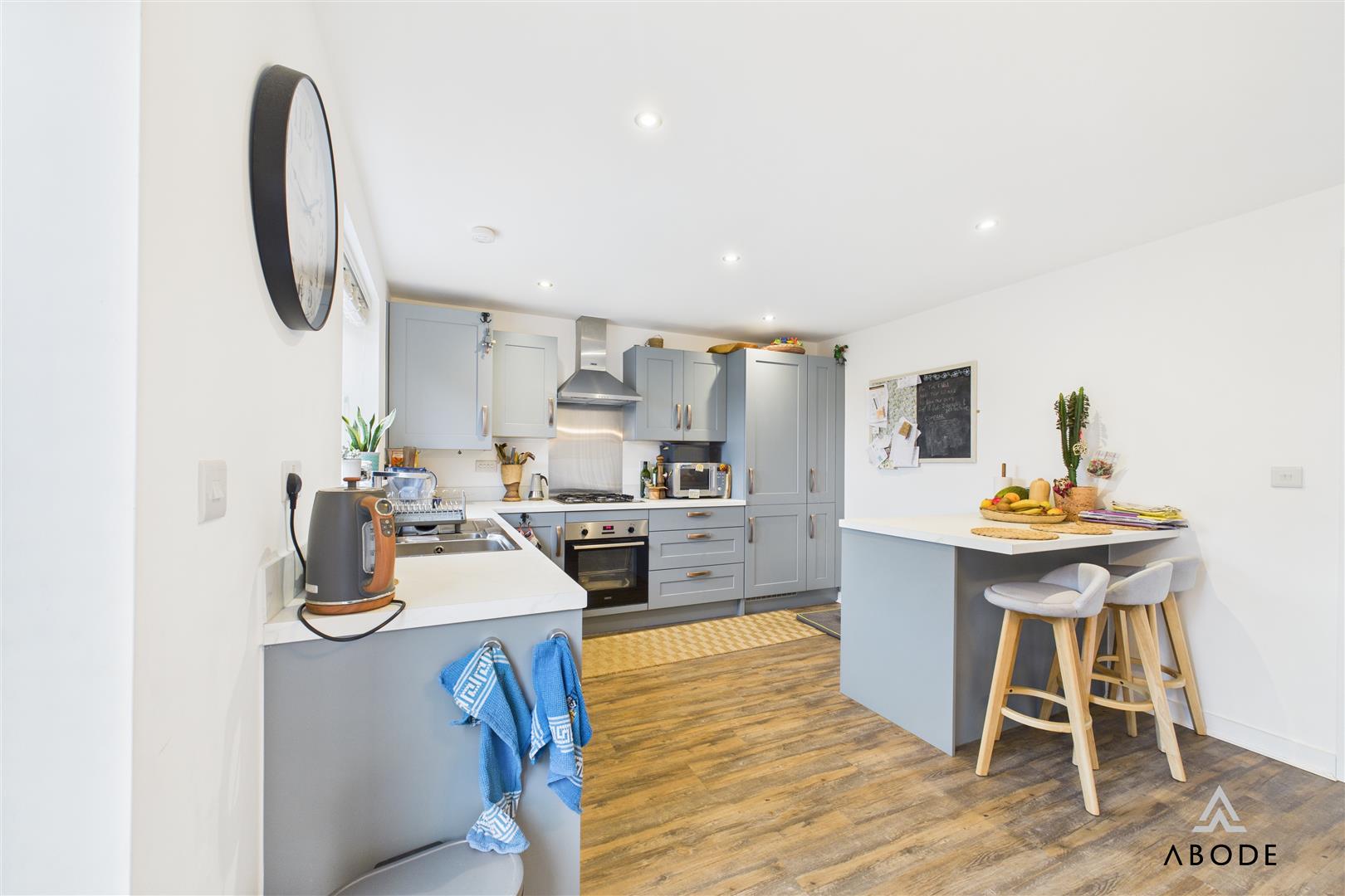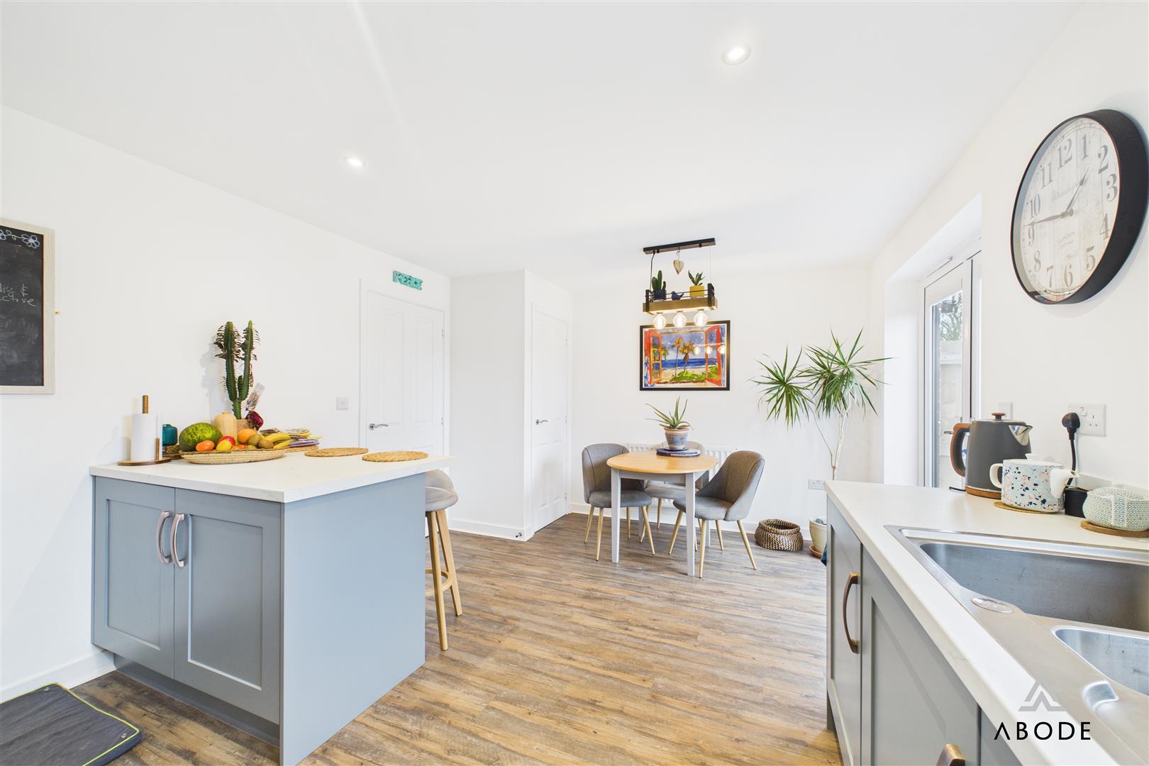 Modern base and eye level units with complimentary worktops, one and a half bowl stainless steel sink with draining board, integrated cooker with gas hob and extractor hood above, washing machine and fridge freezer. Breakfast bar, ample space for a dining table and chairs, UPVC double glazed window to the rear elevation and patio doors leading out into the garden, central heating radiator and under stairs storage cupboard.