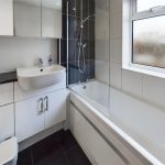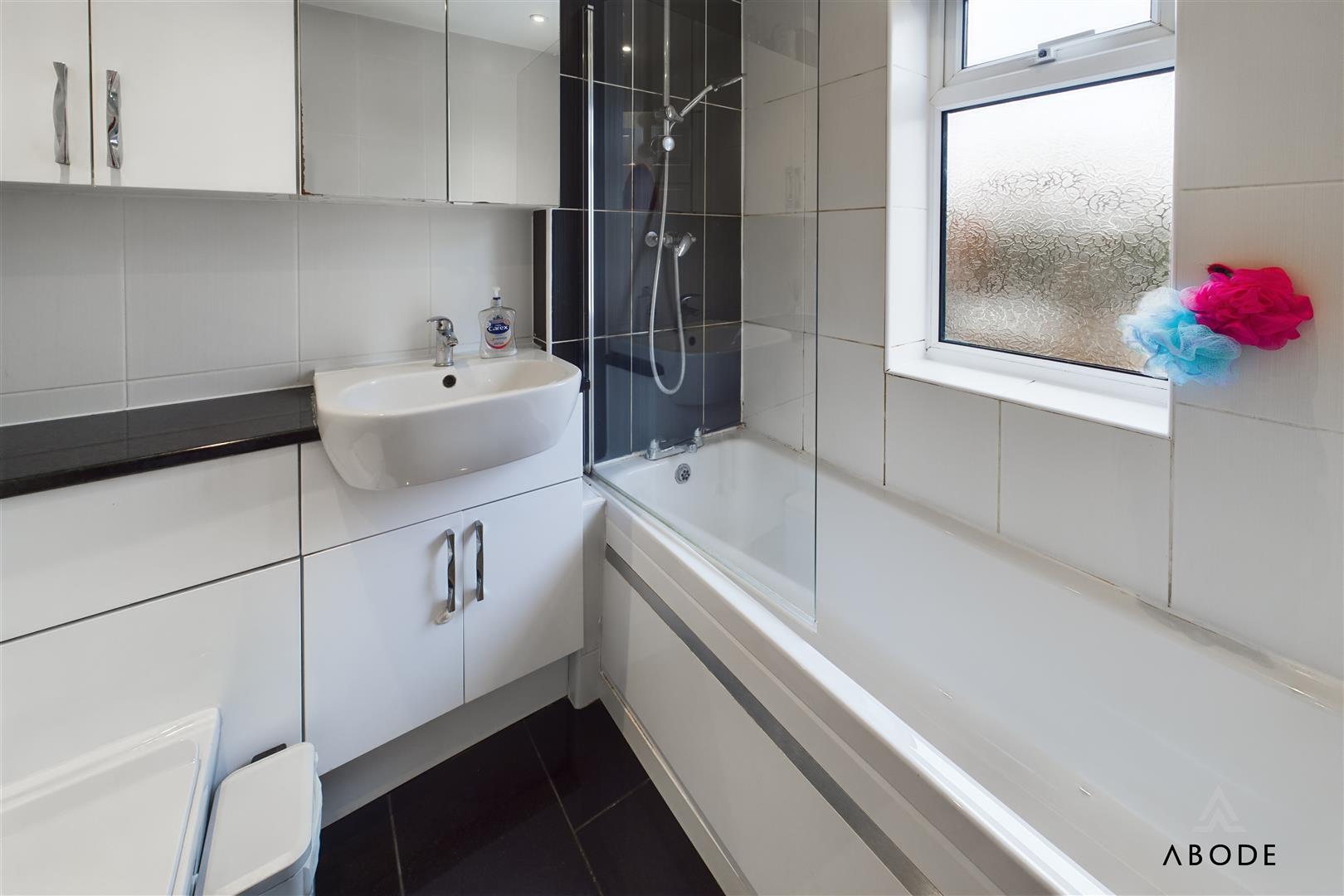 Panel enclosed bath with a shower and shower screen, vanity sink unit with wash hand basin and storage under and matching cupboards above, low flush wc, upvc double glazed window and radiator.