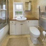 Low flush wc, vanity sink unit with wash hand basin and storage cupboard under, chrome ladder style radiator.