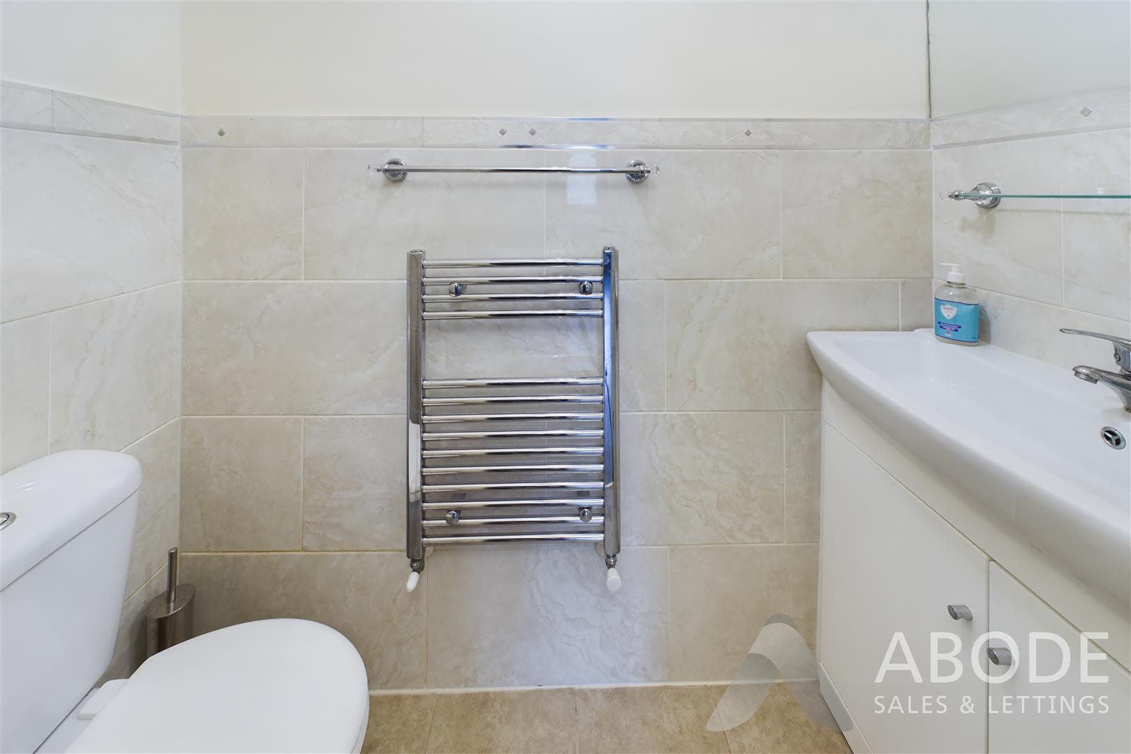Large corner shower, vanity sink unit with wash hand basin and storage under, low flush wc, chrome heated towel radiator and upvc double glazed window.