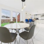 A beautifully presented open-plan living and dining kitchen with a UPVC double-glazed window overlooking the rear garden. The kitchen is fitted with a comprehensive range of matching base and eye-level units and drawers with drop-edge preparation surfaces.