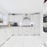 Integrated appliances include a 1½ bowl composite sink and drainer with mixer tap, dishwasher, five-ring stainless steel gas hob with matching extractor hood, oven, grill, fridge, and freezer.