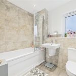 The stylish family bathroom features a UPVC double-glazed frosted window to the rear elevation and a contemporary three-piece suite comprising a low-level WC with continental flush, a floating wash basin with mixer tap, and a bath with folding glass screen and shower over. Complementary wall tiling, chrome heated towel radiator, shaving point, ceiling spotlights, and extractor fan complete this elegant space.