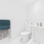 Finished with complementary floor and wall tiling, the cloakroom is fitted with a low-level WC and a floating wash basin with mixer tap. Additional features include a chrome heated towel radiator, ceiling spotlights, and an extractor fan.