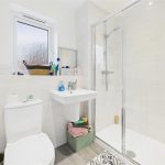 A modern en suite featuring a UPVC double-glazed frosted window to the side elevation. The suite comprises a low-level WC with continental flush, a floating wash basin with mixer tap, and a double shower cubicle with sliding glass screen. The walls are finished with complementary tiling. Additional features include a chrome heated towel radiator, ceiling spotlights and an extractor fan.