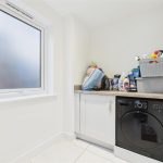 With a UPVC double-glazed frosted window to the side elevation, the utility room offers continued tiled flooring and includes a base-level storage cupboard housing an integrated washing machine, with additional space for further white goods. There are drop-edge preparation surfaces, ceiling spotlights, a central heating radiator, and an extractor fan.