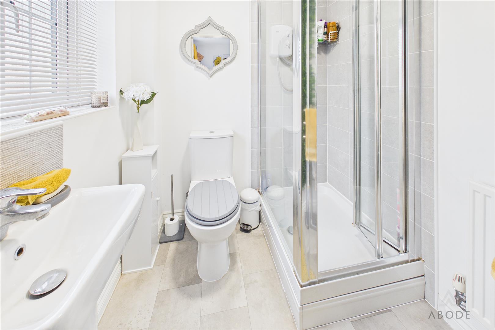 Enclosed shower, wash hand basin, low flush wc, radiator and upvc double glazed window.
