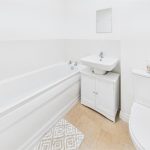 Panel enclosed bath, low flush wc, wash hand basin and radiator.