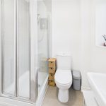 Shower, low flush wc, wash hand basin, radiator and upvc double glazed window.