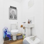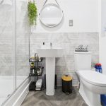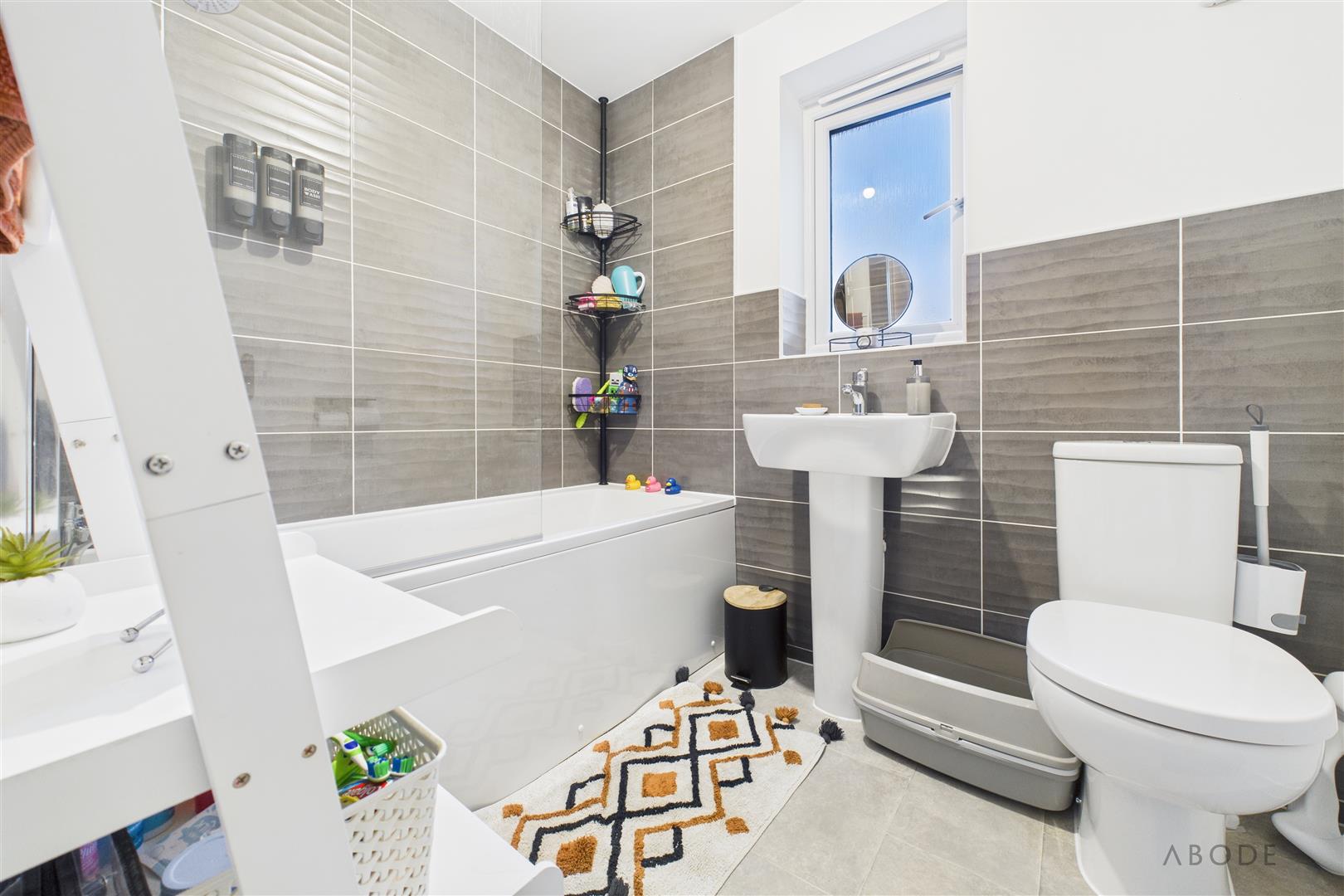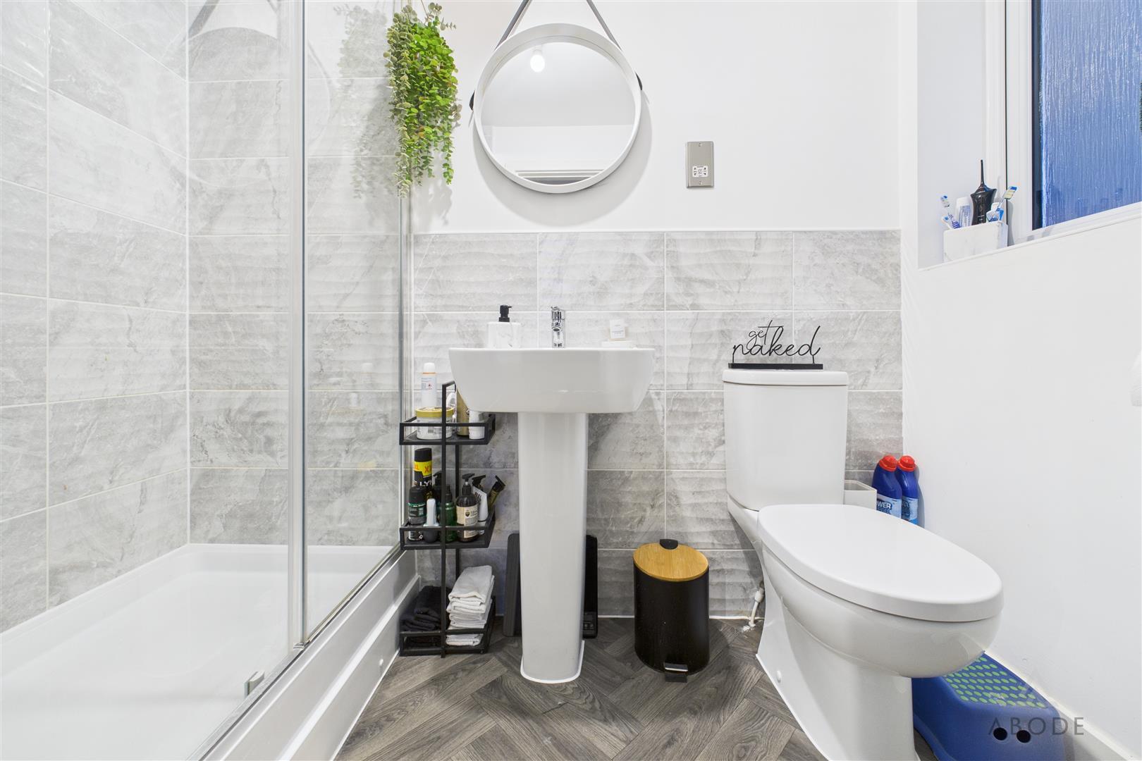 Modern white suite comprising;- WC, wash hand basin and double shower cubicle with glass shower screen. Partially tiled walls, UPVC double glazed window to the rear elevation and towel radiator.