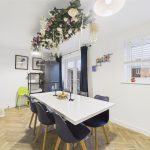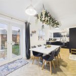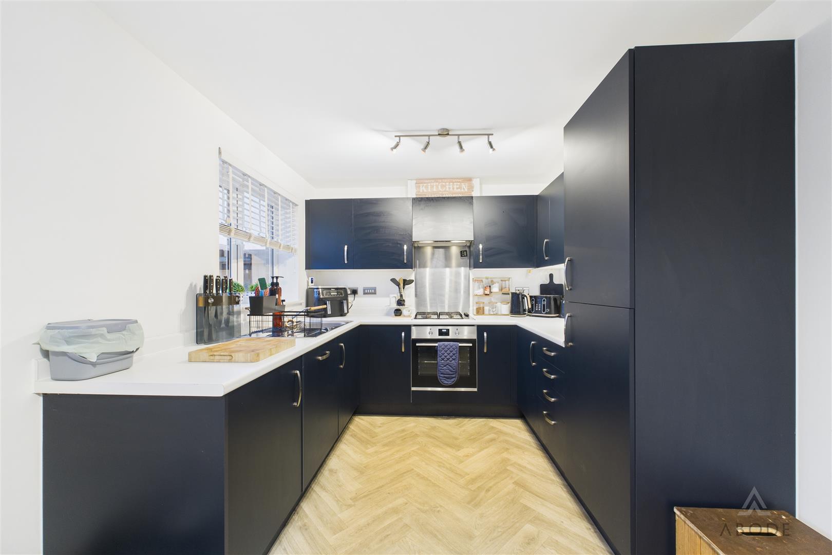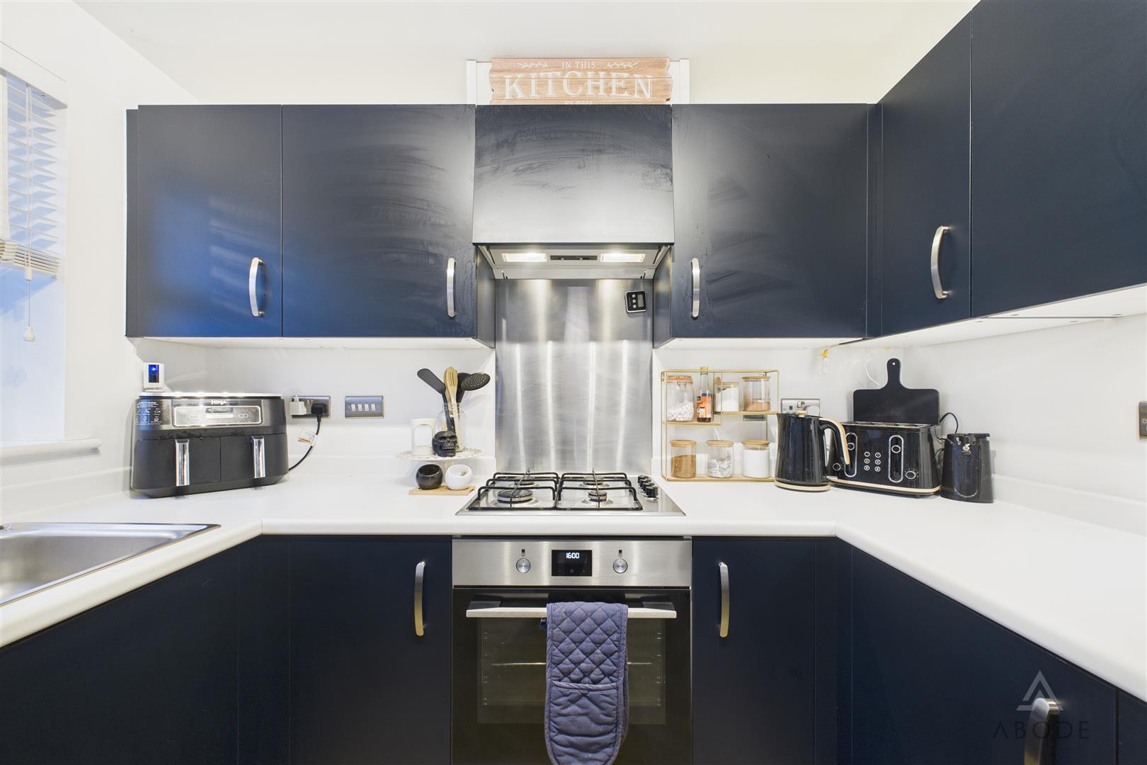 Base and eye level units with complimentary worktops, one and a half bowl stainless steel sink with draining board, integral cooker and hob with extractor hood over, integrated fridge freezer, dishwasher and washing machine. Two UPVC double glazed windows to the rear elevation and patio doors leading out into the garden, central heating radiator, storage cupboard and ample space for a dining table and chairs.