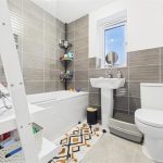 Modern white suite comprising;- WC, wash hand basin and bath with shower over and glass shower screen. Central heating radiator, partially tiled walls and central heating radiator.